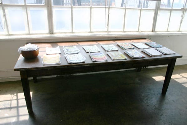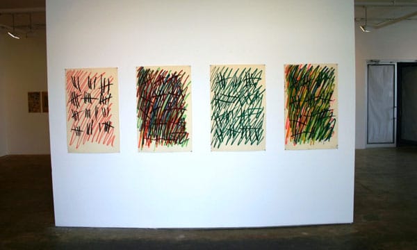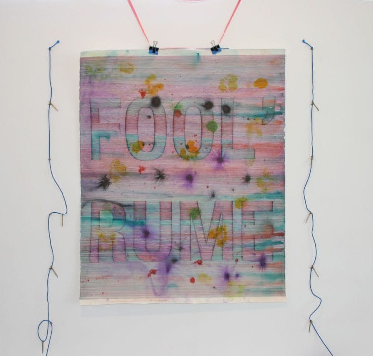 The work itself is abstract, painterly and sketchy. There is an obvious tongue-in-cheek dialogue with abstraction. Joachim Friederich’s large scale paper works resemble what might happen were an Abstract Expressionist painter forced to scratch a jail style calendar into the walls of a prison. His wall of collage and paint stick on vintage newspaper is thoughtful and endearing in turn.