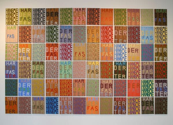 Matt Conolly’s brightly colored large scale paper drawings used pins, clamps and rope that lent an overwhelming sense of mischief to the room. Joshua Abelow’s installation of 72 brightly color oil paintings, titled Mystic Truths, felt a bit like Mel Bochner, but nonetheless dominated the space, radiating humor from the back wall. In fact, all of the work in the show seemed familiar, not because it was but because it in some way resembled the work of other, older artists. The three artists have clearly been thinking along similar lines, there is a sense of co-conspiracy as all three artists seem to be sparring with and working through their influences. Rather than seeming derivative the result is a wryly humorous and disarmingly honest show of work by mostly young and premonientally New York-based artists (Matt Connolly is based in LA and Joachim Friedrich is about 70 years old).