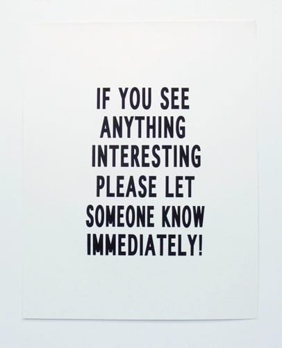 It wasn’t entirely bleak. A highlight was Partisan, a project curated by Rachel Funari and Karsten Lund, independent curators based in Chicago. Immediately outside the project space a screenprint by Mads Lynerrup read “IF YOU SEE ANYTHING INTERESTING PLEASE LET SOMEONE KNOW IMMEDIATELY!” Obviously it’s a play on the homeland security warning signs, but within the context of the fair I assumed that meant they’d take steps to remove the interesting object. I suppose if I were in a more generous mood I might have also read it as a humorous sales pitch.