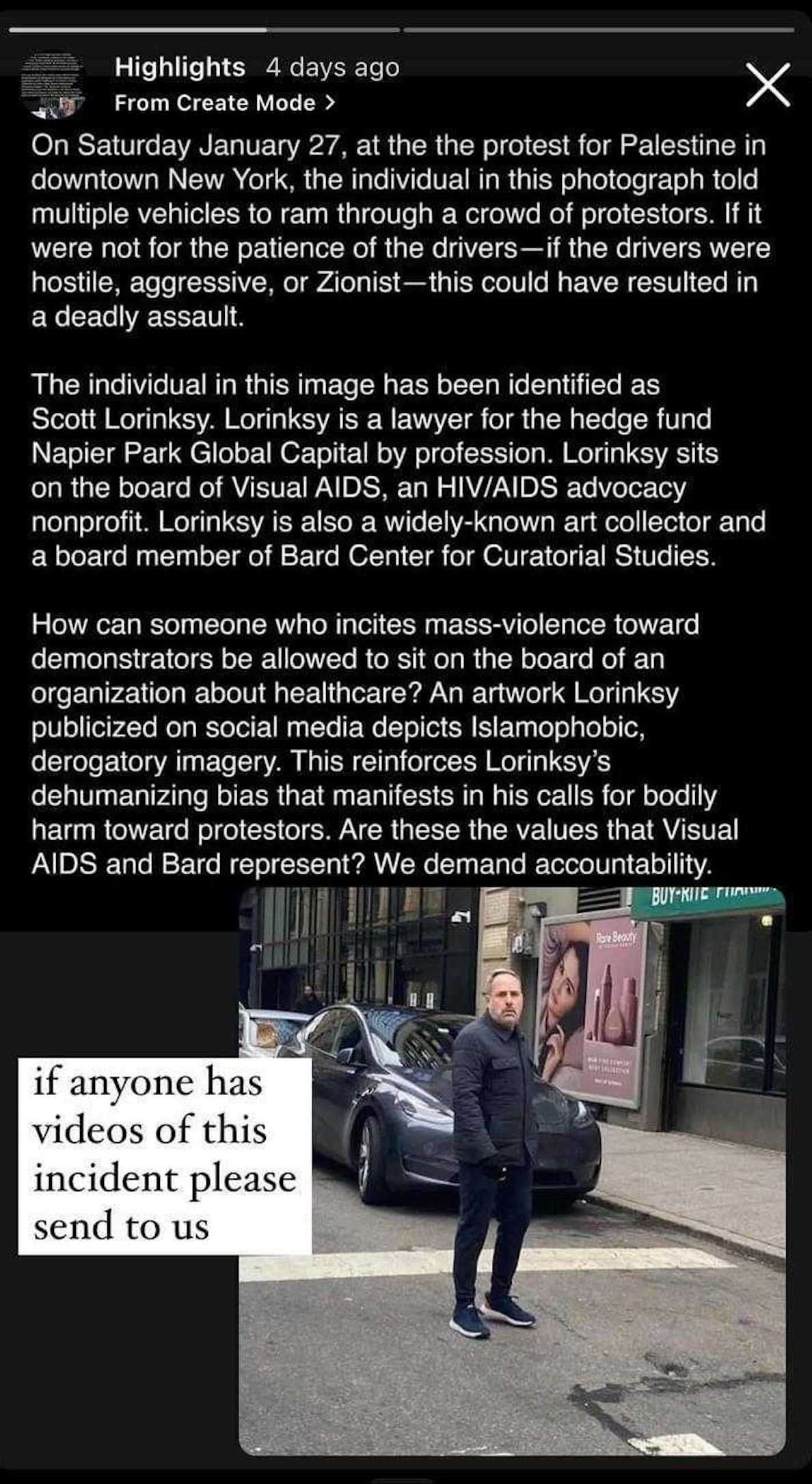 On February 2, an anonymous activism account called Decentralize Culture published a 24-hour Instagram story photo of a man who was allegedly onsite during the pro-Palestine demonstration in Downtown Manhattan on Saturday, January 27. The account's story alleged that the man, whom it identified as Lorinsky, "told multiple vehicles to ram through the crowd of protestors." Hyperallergic was unable to independently confirm the claims.