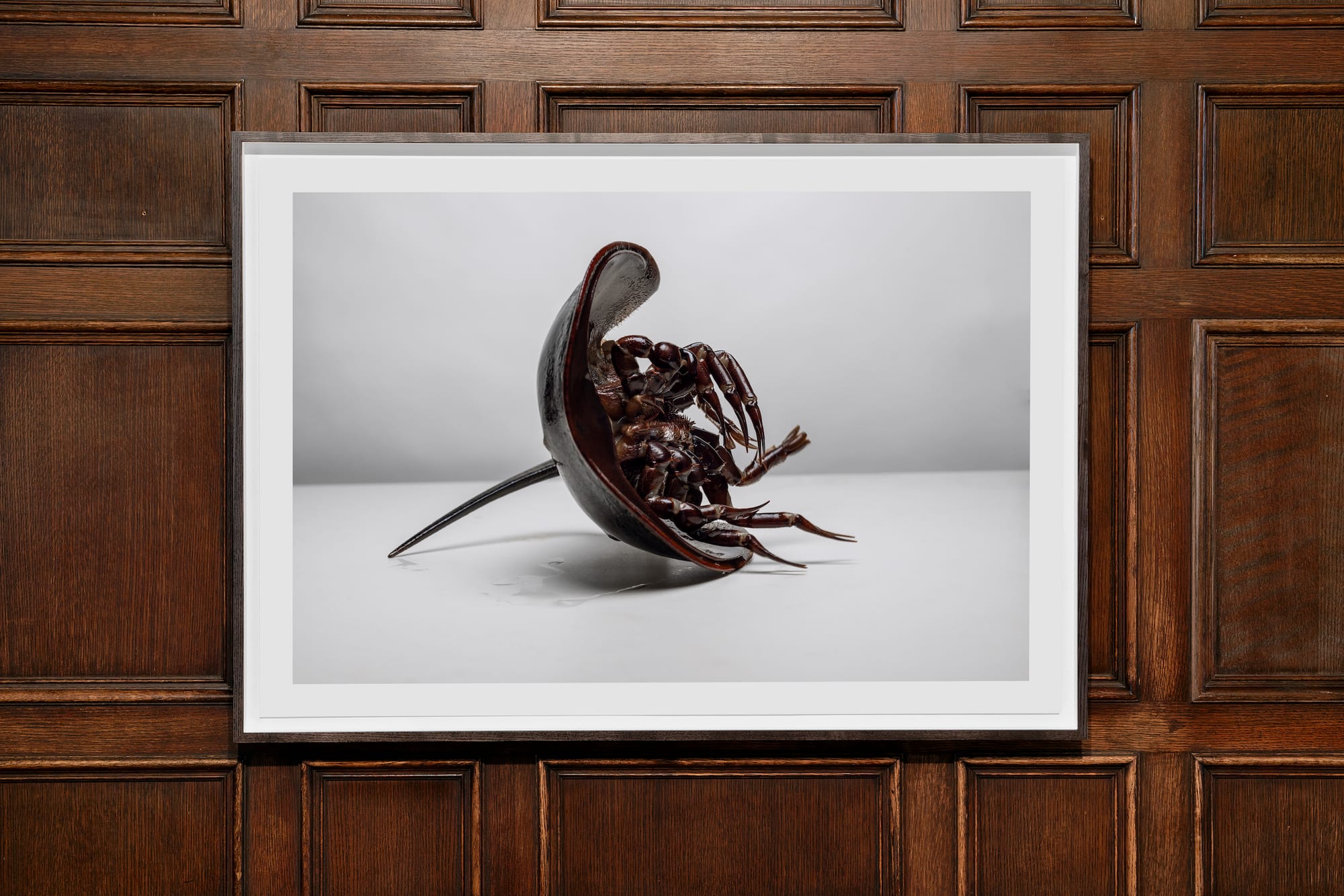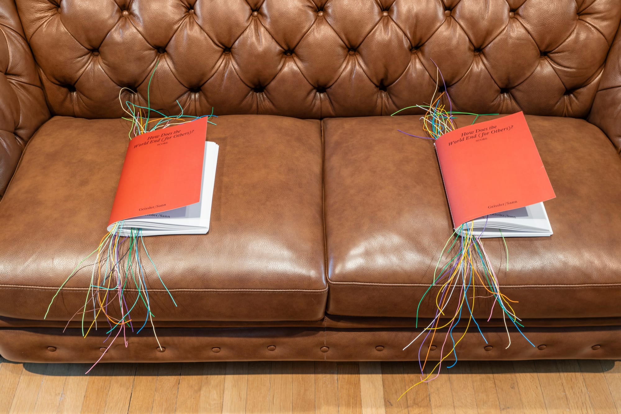For all the excesses of Kendler’s and Peterman’s projects — reams of literature, tons of plastic, millions of years — their outward forms are unrelentingly minimalist and compacted. Maximalism ill suits environmentalism. Beate Geissler and Oliver Sann’s contributions to the Library are no exception. A couple working collaboratively since 1996 and more recently as members of the Anthropocene Working Group, a decade-long initiative of the Haus der Kulturen der Welt, they present two artworks from the suite “How Does the World End (for Others)?” The “others” in question are horseshoe crabs, survivors of five mass extinctions over the past 475 million years and today severely endangered by human exploitation, portrayed in an impeccably clinical photographic diptych, tilted helplessly on their sides. The “others” are also everyone and everything, as represented in bound copies of a score, available for perusing on the gallery couch or witnessing at the Earth Day performance event. The score makes for a lively and humbling read. The first part is the past: a timeline from Deep History through the Cambrian Period, the Holocene, Modernity, and the Great Acceleration, complete with pointed notes to the artists from a cohort of earth scientists, debating the finer points of the major catastrophes and developments that have shaped the world up to now. The second part is the future: brief synopses of 47 books of climate fiction, chronologically ordered according to the period in which they are set. As a genre, cli-fi has been around for about a decade, though novels that deal with environmental change have been around far longer, mostly understood as science fiction. But as their tales approach reality, the sci-fi category has become scarily inapt.