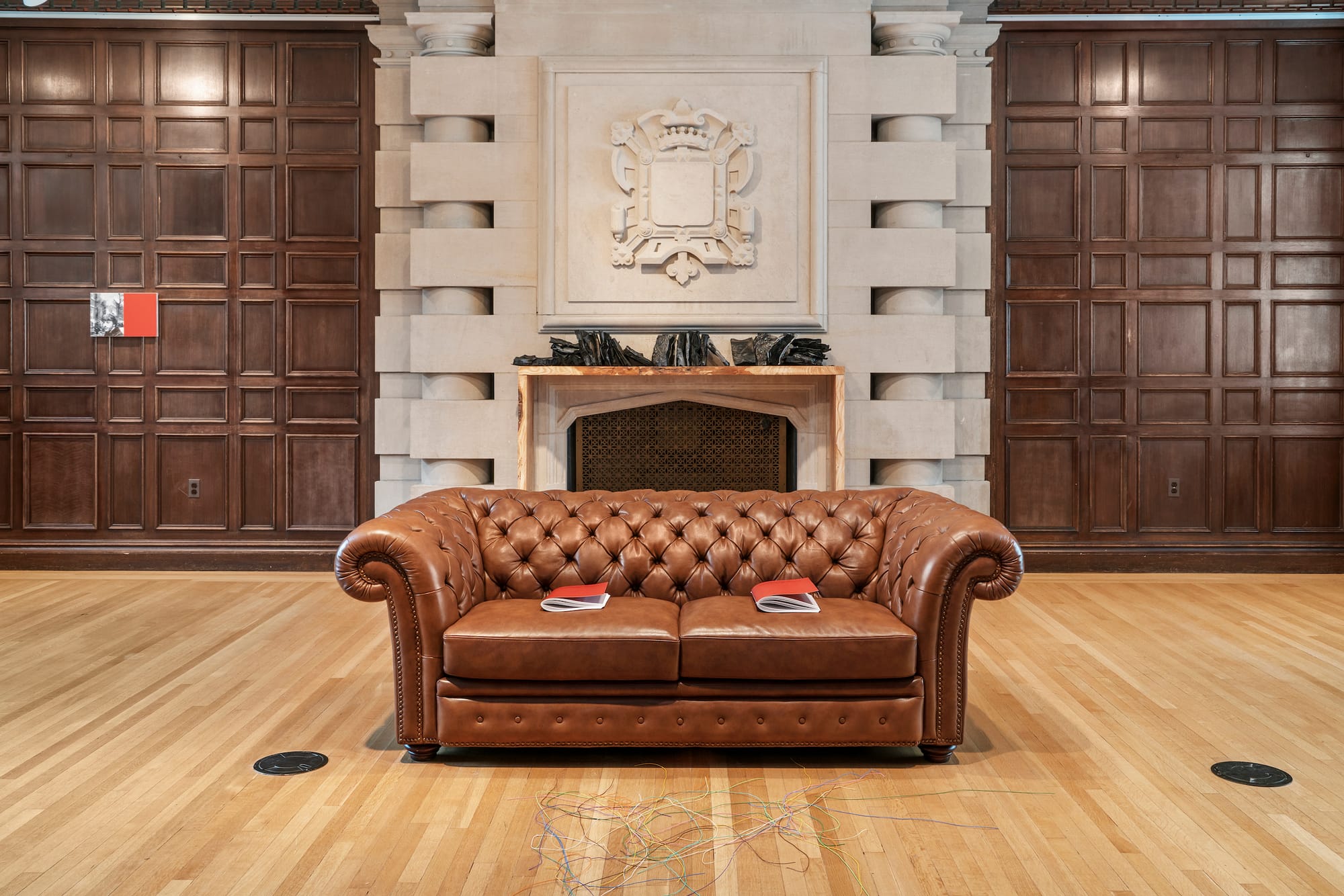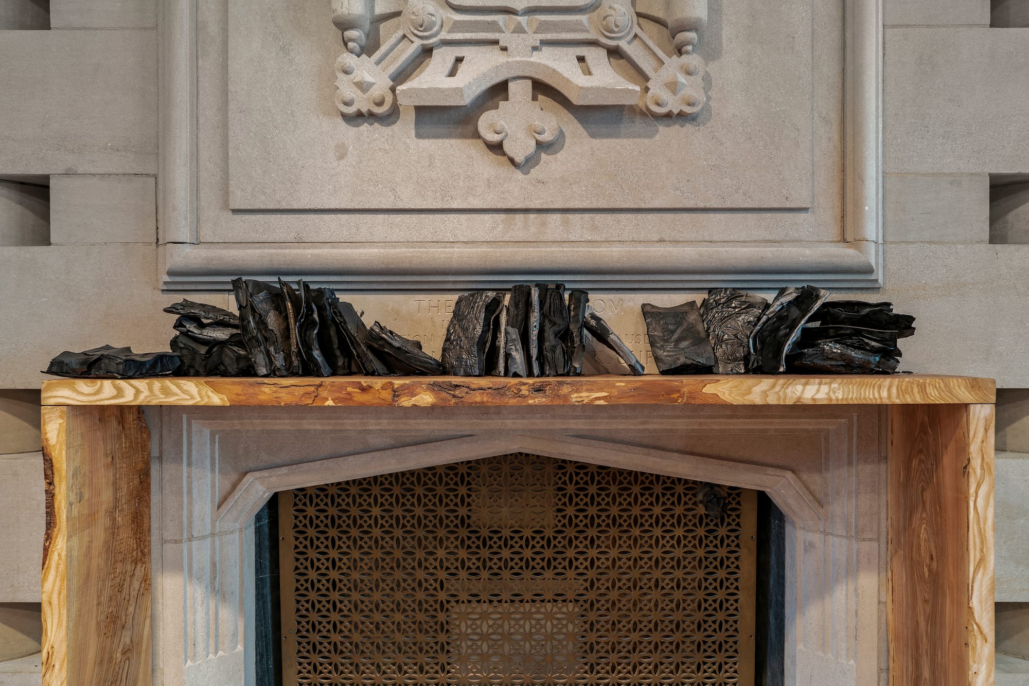 For whom will the bells toll? Well, a musical performance for an event dubbed “Quartet for the End of Time” has been scheduled for Earth Day. Also, there’s those cremated books, representing four decades of writing on climate change, from technical manuals to best sellers. Kendler began “Underground Library” in 2017, so called because each set of books, after being burned in a low-oxygen process that produces a highly stable form of carbon, is buried in the earth, thereby sequestering carbon and benefitting the surrounding soil and plants. In between incineration and interment they are displayed, here on an attractive fireplace mantel of blond timber made readily available by the emerald ash borer, an invasive species responsible for a 46% decline in the region’s ash tree population. The volumes themselves are terrifyingly beautiful: matte and flaky, warped and shimmery, in every shade of black and every kind of wrong. A few title fragments can be deciphered (Economic Consequences of a Hotter Planet, Love in the Century of Extinction) but otherwise the texts — thousands of pages worth of appeals to save the planet by some of the world’s great science writers — have been rendered as silent as their messages falling on deaf ears.