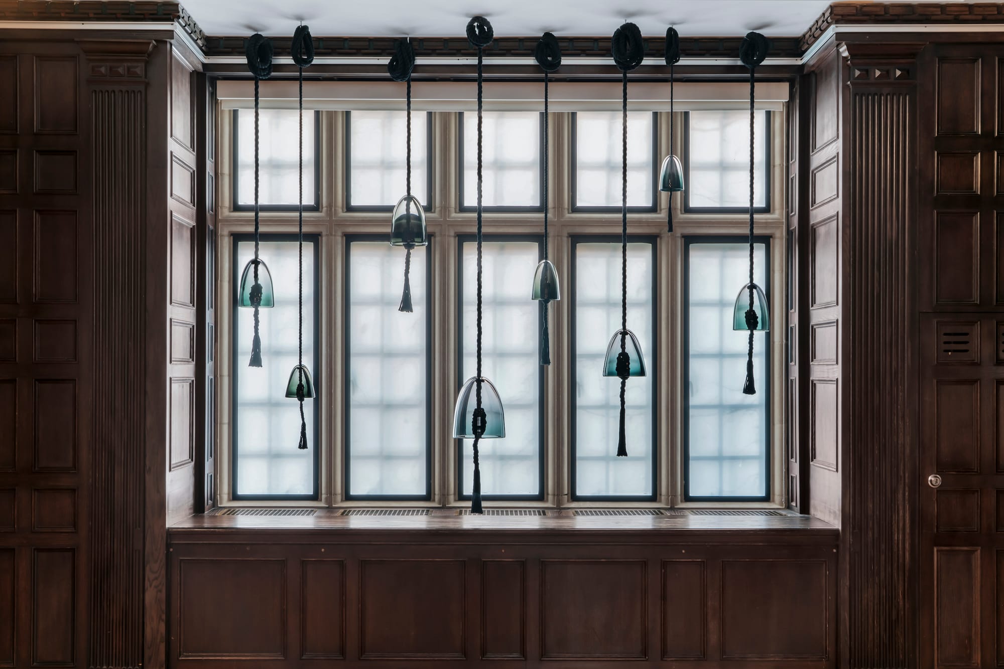 At the Cli-Fi Library, the artist dealing most explicitly with the aesthetics of catastrophe is surely Jenny Kendler. The National Resource Defense Council’s artist-in-residence since 2014, Kendler has been making drawings, sculptures, and performances about interspecies coexistence, ecological troubles, and native plant life for two decades. Stylistically the work has ranged from quirky and playful to bold and beautiful; more recently it has seemed elegiac. “Underground Library” and “Whale Bells,” on view here, feel like an invitation to collective mourning. The bells, made with Andrew Bearnot, are an ongoing series of black ombré glass domes, handblown to evoke whales surfacing vertically to inspect their surroundings, a behavior called spyhopping. Inside dangle clappers made from the fossilized ear bones of an ancient cetacean related to modern humpbacks, a species that finally recovered from being hunted to near extinction only to be threatened anew by vessel strikes, fishing gear entanglement, and excessive noise. In a sunlit window well at the Neubauer, eight of the 30 bells made to date hang silently from black rope, like so many shrouded mourners, waiting to sound a death knell.