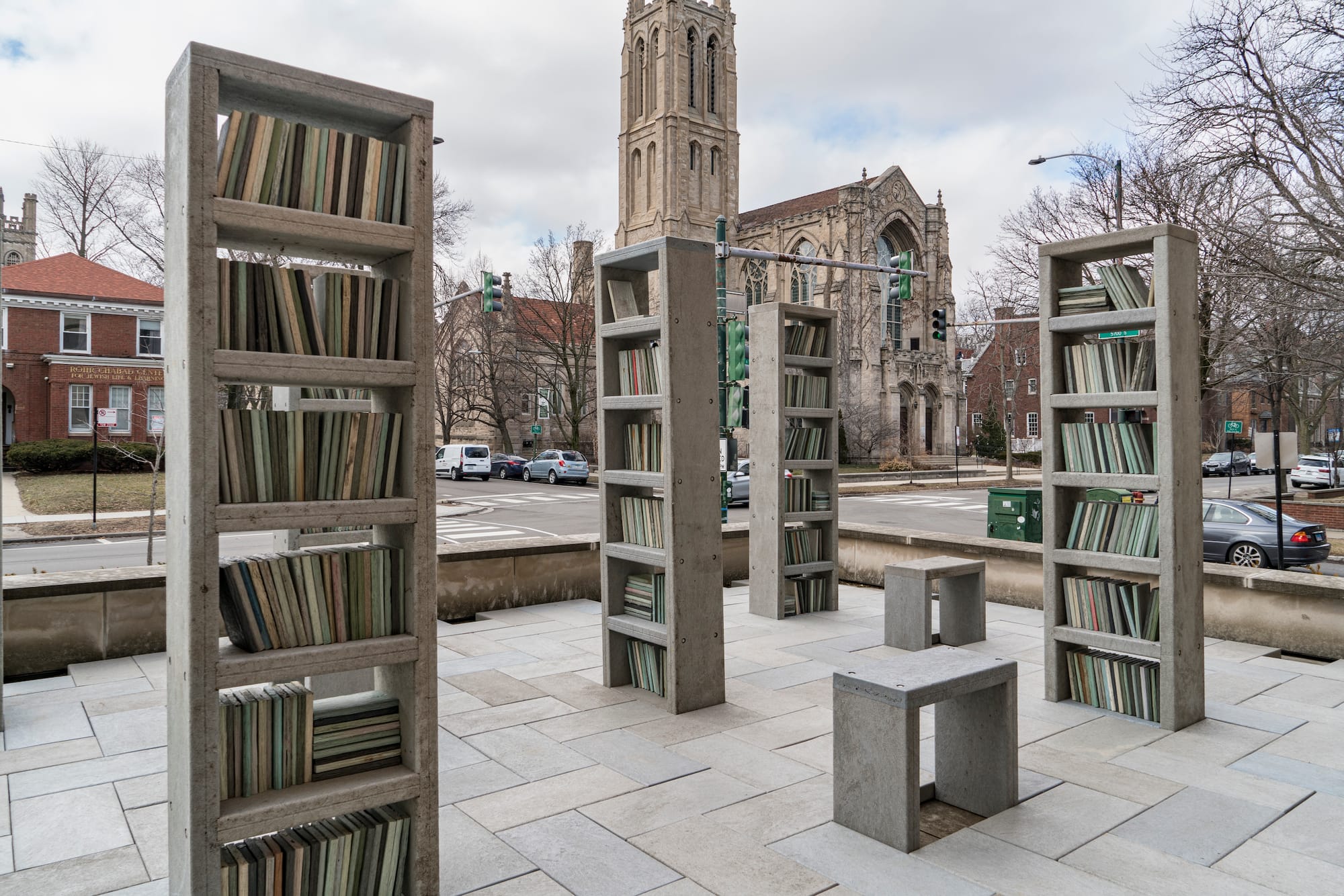 Dan Peterman has also stocked the Cli-Fi Library with books and shelves. One ton of books, to be precise, plus an outdoor installation of shelving, flooring, and benches equivalent to the average annual plastic consumption of 57 individuals. Everything is made from planks of post-consumer recycled plastic, even the “books,” which, not unlike proper books, provide information about their content — namely, plastic — and can be “read” in terms of texture and color. A longtime fixture of the Chicago artist-activist community and a developer of Blackstone Bicycle Works, the Experimental Station, and many other neighborhood infrastructures for dealing critically and creatively with urban waste and need, Peterman has worked for decades with a variety of recycled materials: for Documenta 14, he exhibited thousands of copper and iron ingots cast from industrial waste and salvage. But his go-to, because it’s the world’s go-to, is plastic. He’s used it to build everything from discrete sculptures to two of the most functional public artworks in downtown Chicago: an outdoor dance floor and a 100-foot-long picnic table. If some of that sounds pragmatic and convivial, it is, but none of it has the guilt-free effect so common to eco-friendly consumer goods. Peterman’s artworks never forget that they are the products of material excess and environmental neglect.