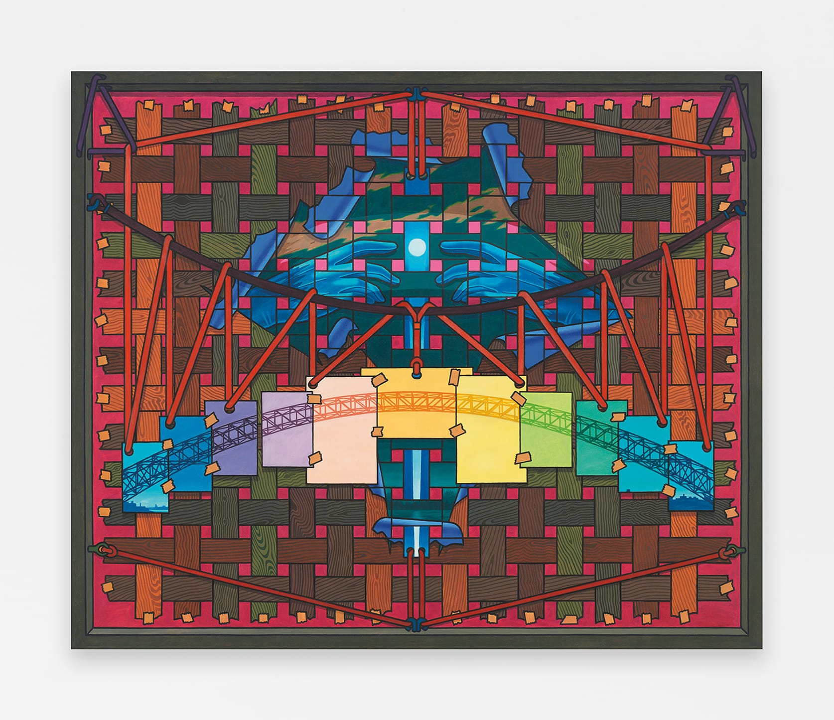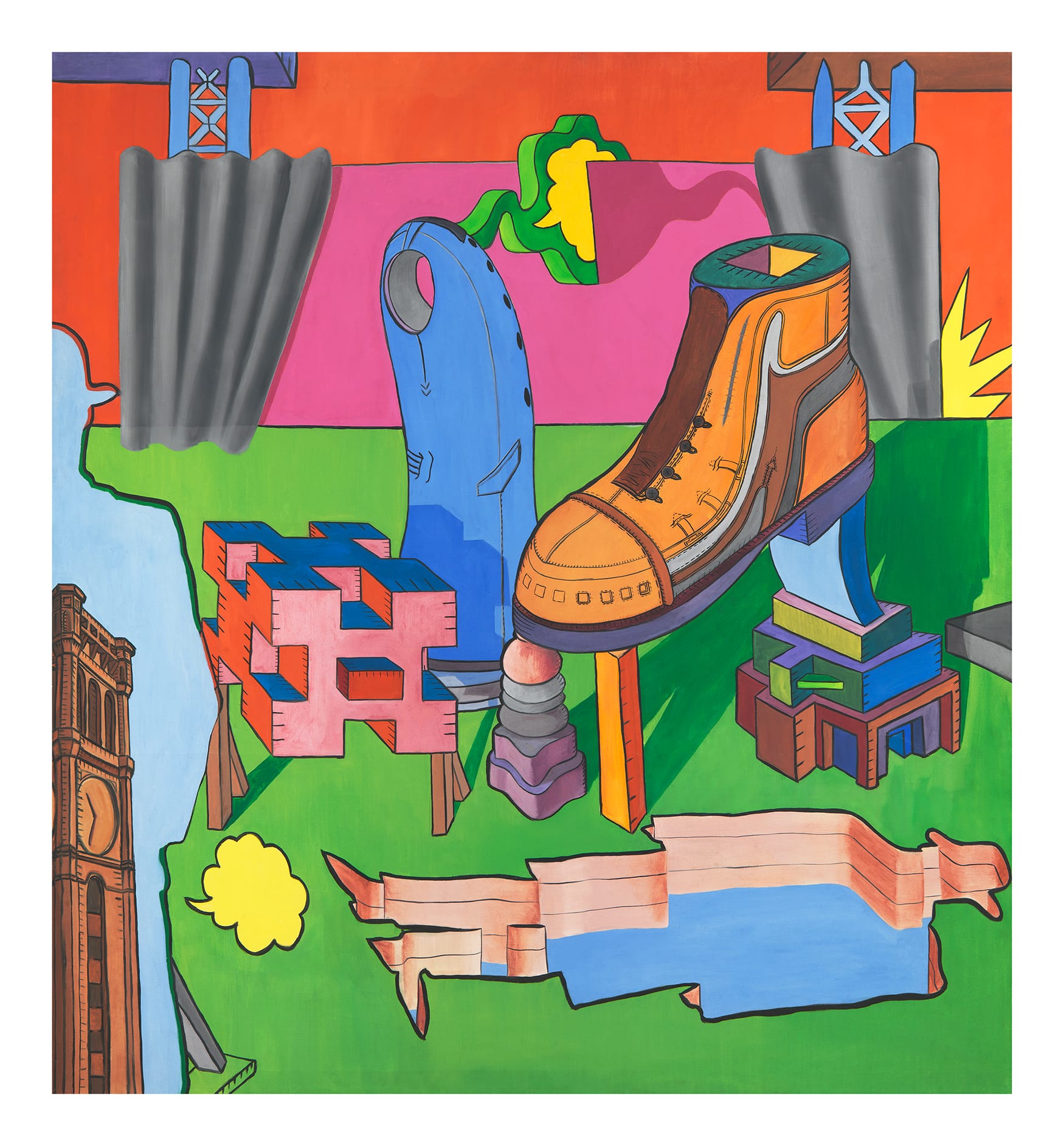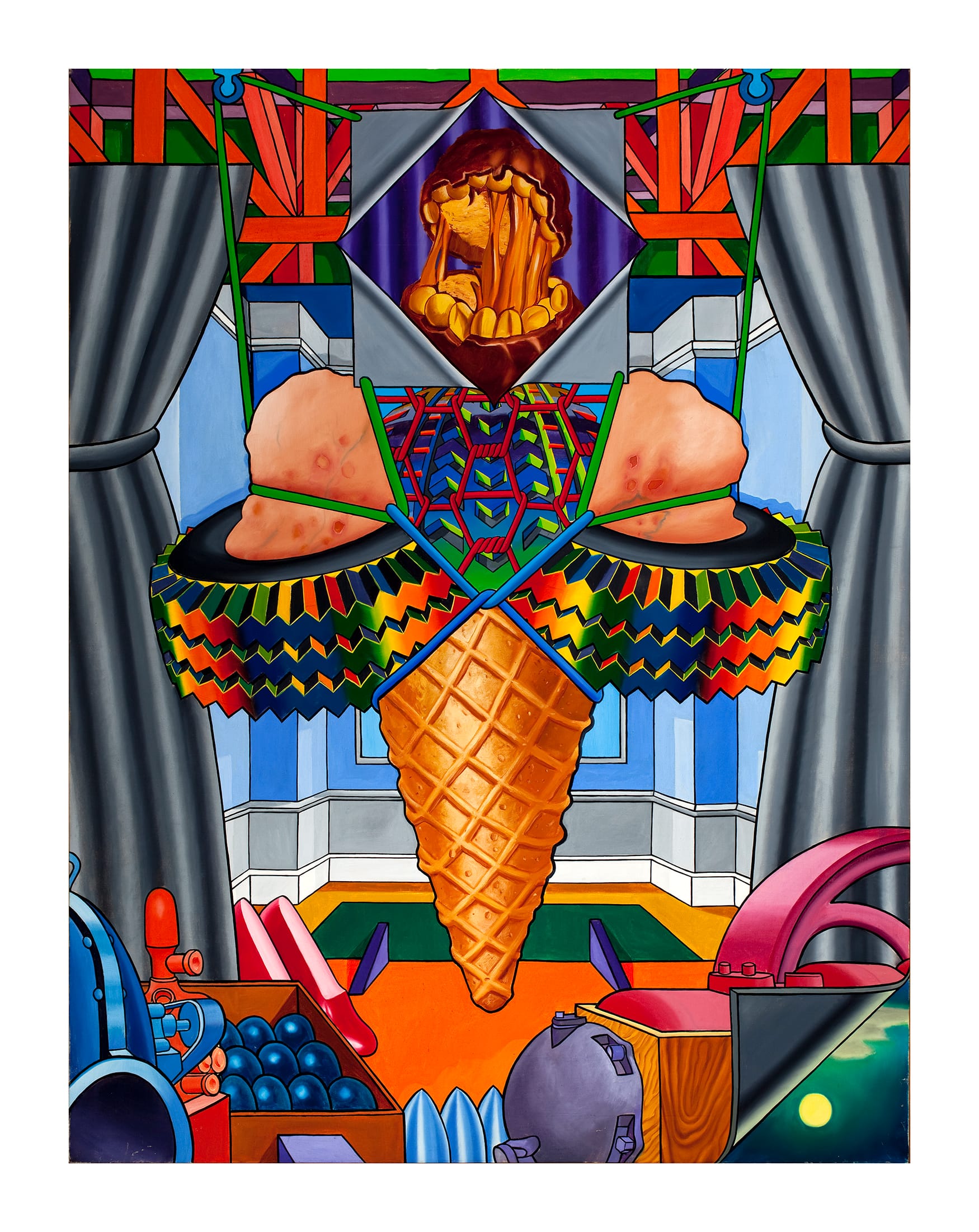 In his work, Green repeatedly revisited universal motifs — ice cream cones, Necker cubes, patterned quilts, tires, scissors, wood grain, painted fingernails, twisting and intertwined cables, and so on — rendering them fastidiously with hyper-saturated or arbitrary colors. Through his use of gradients, isometric perspective, and black outlines, Green's confounding compositions are simultaneously layered and flat, pushing his practice toward op art with his noted flair for trompe l'oeil tricks of the eye.