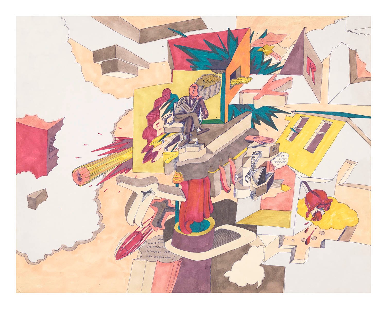 Despite working primarily in oil, Green's own work also embodied the flattened, comic quality at the time, and he soon infused it with more prominent threads of Surrealism and vibrant abstraction after Hairy Who? disbanded in 1969. Green began explorations with linear perspective and depth, form and dimensionality, and patterning.