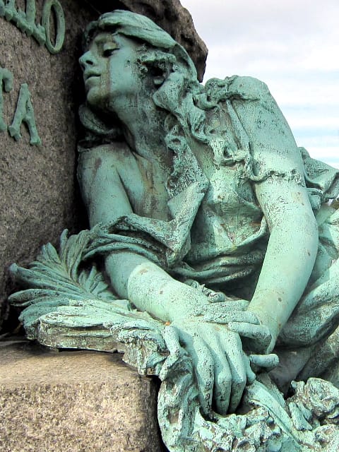 Another striking sculpture from the early 20th century is the monument to Rose Merello Guarino, a bronze of a woman collapsed against a grave clutching ferns and flowers (symbolic of the resurrection and life cut off in its flourish), her hair tossled and dress slipped down her shoulder. Rose was a daughter in the wealthy Merello family and fatally shot and killed at a young age by a vengeful caretaker in their home.