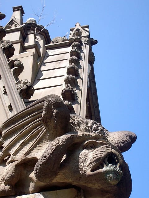 Of course, few gatherings of art are without their faults, especially when it comes to self-memorializing, where the ostentatious often wins over subtlety. John Matthews, the “Soda Fountain King” who made his fortune on carbonated water innovations, rests beneath a catafalque designed by Karl Muller at a cost of $30,000. The style of tomb is usually reserved for royalty, yet a now badly worn statue of Matthews rests below a canopy of engravings of his life, including pensive moments on the idea of soda water. The art critic Effie Brower called the monument with its garish water-spouting gargoyles and jumble of spires “depraved,” although it did win an award in mortuary art in 1870.