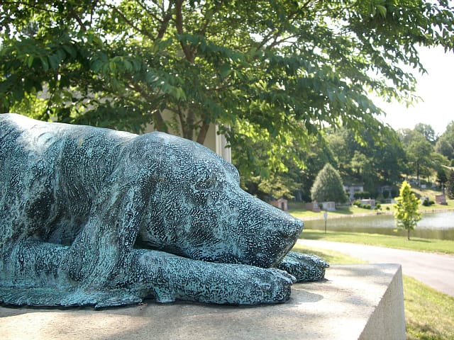 There is also the playful memorial to William Holbrook Beard, known for his paintings of anthropomorphic animals, such as “The Bulls and Bears in the Market” (1879) at the New-York Historical Society, where animals rampage at the Stock Exchange. The bronze bear on his tombstone was created and donated by Dan Ostermiller to give the influential artist a fitting tribute when previously he was in an unmarked grave.