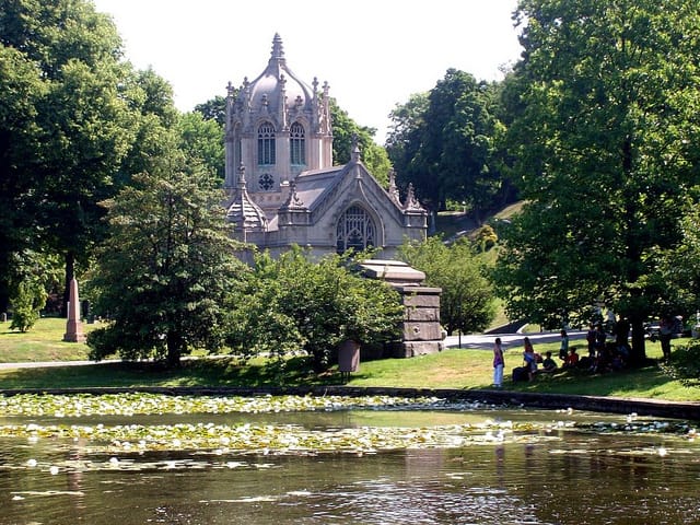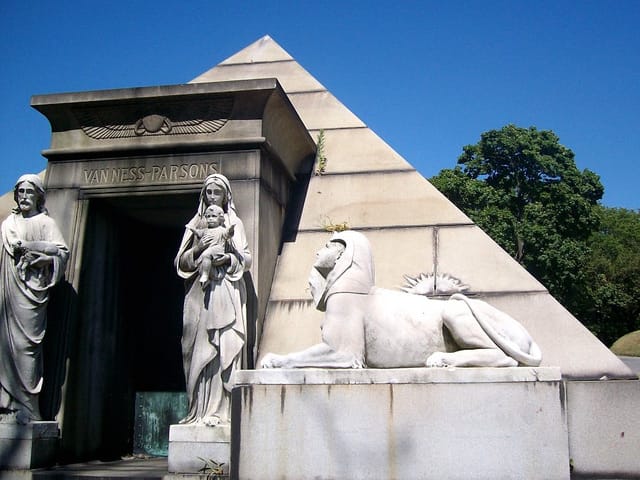 With its serpentine paths and lush landscaping, along with a wealth of 19th century sculpture and the graves of many of the most significant New Yorkers, Green-Wood Cemetery in Brooklyn is the perfect place to start to delve into cemetery exploration. Since moving to the neighborhood around it shortly after I arrived in New York, I’ve been captivated by the place, discovering something new every time I walk under its spired Gothic entrance by Robert M. Upjohn. I now lead walks there periodically with the Atlas Obscura, an organization devoted to the hidden wonders of the world, and have continued to discover cemeteries around the city and how they relate to its history.