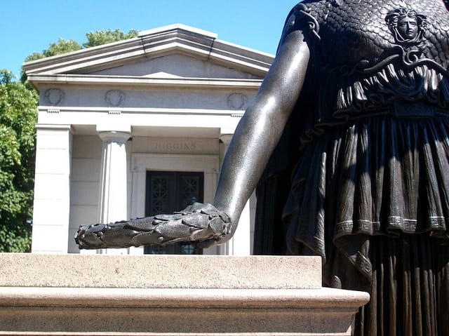 Probably the most visited work of art in Green-Wood is the statue of Minerva. Funded by businessman Charles Higgins, whose mausoleum is just behind the statue, it was dedicated in 1920 on Battle Hill, the highest point in Brooklyn and the site of the first major engagement of the Revolutionary War. The bronze Roman goddess, sculpted by Frederick Wellington Ruckstull, raises her arm to another metal lady out in the harbor, with the Statue of Liberty returning her salute.