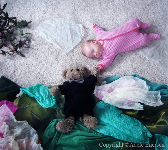 It’s fun to come across these sort of random collisions of art history and something that might easily be passed off as kitsch, but clearly isn’t. What sets this work apart, I think, is the visual sensitivity and the genuine sense of fun and play that Enersen clearly brings to her photos. Compare Enersen’s off the cuff creativity with Anne Geddes’s terrifically kitschy photos of babies nestled in outstretched hands or dressed in bumblebee costumes laboriously manipulated in Photoshop into flower pictures, and it’s pretty clear that Enersen comes through with the truer emotion. Though her baby pics do sometimes dip into the cliche, they have a refreshing sense of artistic vitality, like fun studio experiments.