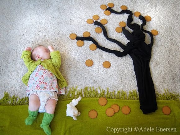 Adele Enersen photographs her dozing daughter Mila in a variety of poses and scenes, often drawn from art history. The visual similarities between her homemade work and her sources is pretty cool, as is its relationship to art history. What other options for inspiration could Enersen pursue?
