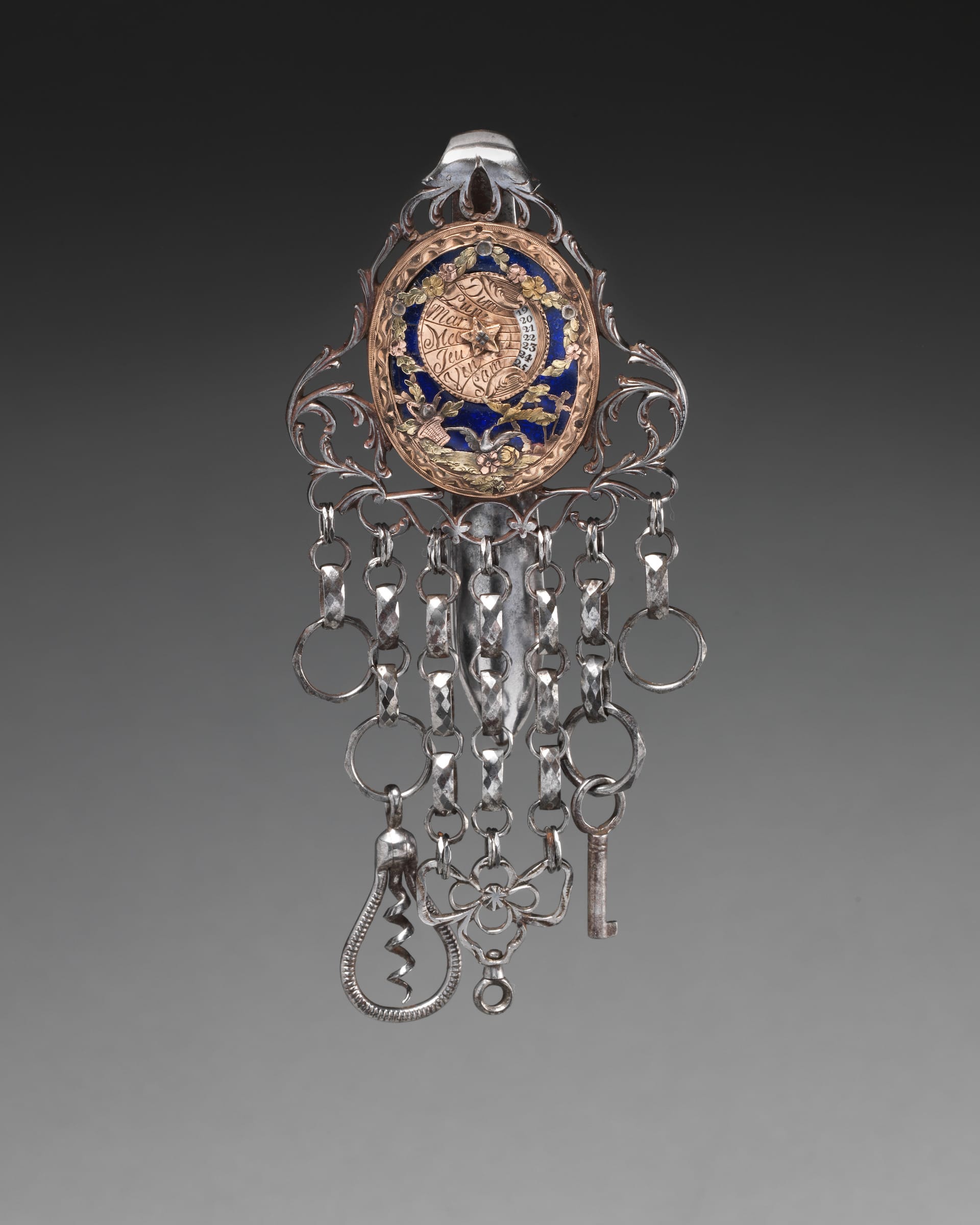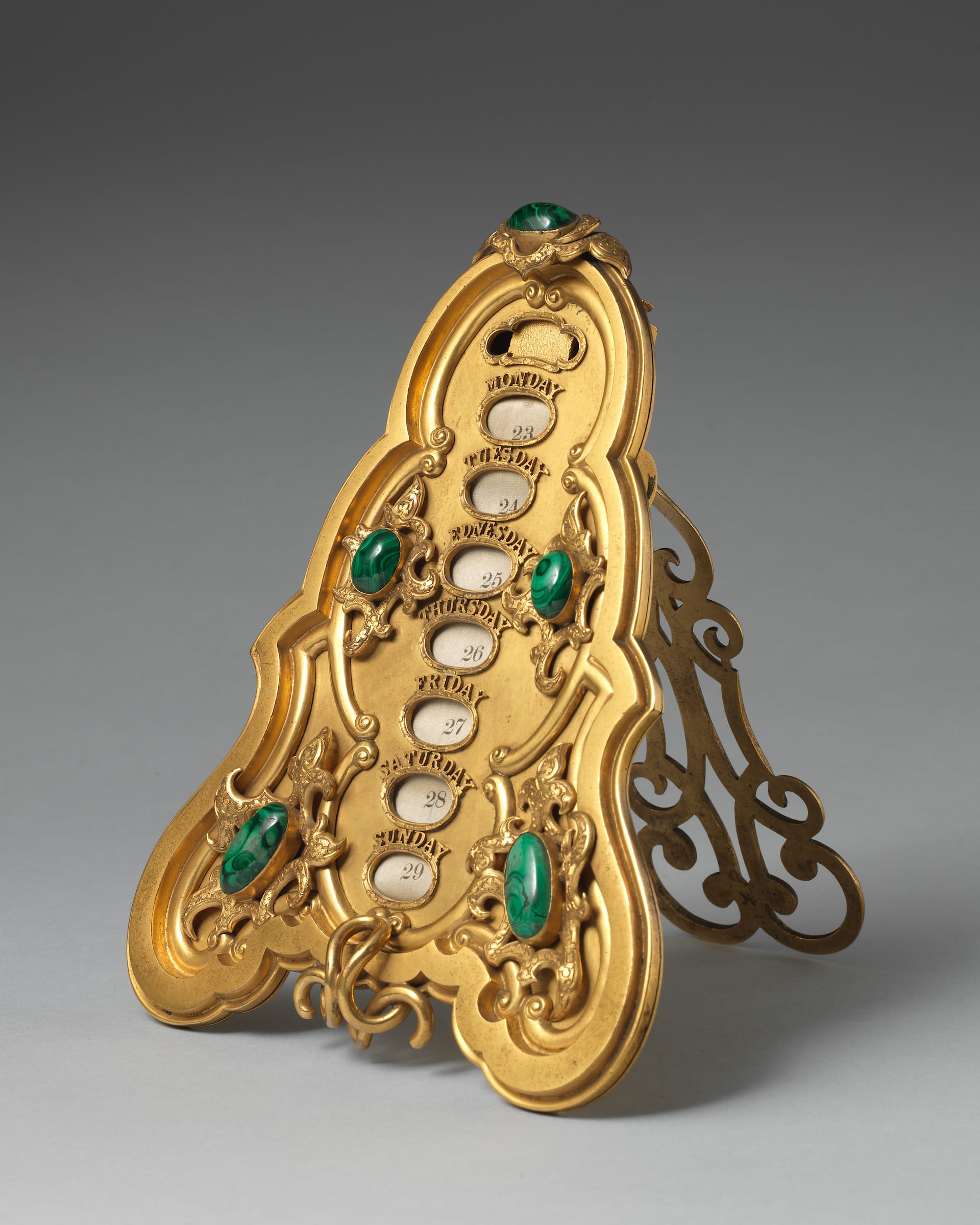 On the other side of the world, women in 18th- and 19th-century France were wearing chatelaines — a practical ornament that would be attached to the hip and carried items the wearer might need throughout the day, such as notebooks, pencils, watches, and even tweezers. A version at the Metropolitan Museum of Art includes a calendar with the days of the week etched in gold and the date on a rotating sheet of enamel. In another highly ornamented calendar, luxury goods company Asprey created a gilt bronze and malachite mechanism — again displaying only the days of the week and the date — for the 1851 exhibition at London's Crystal Palace. Around 14,000 exhibitors showcased goods ranging from pistols to fake teeth.