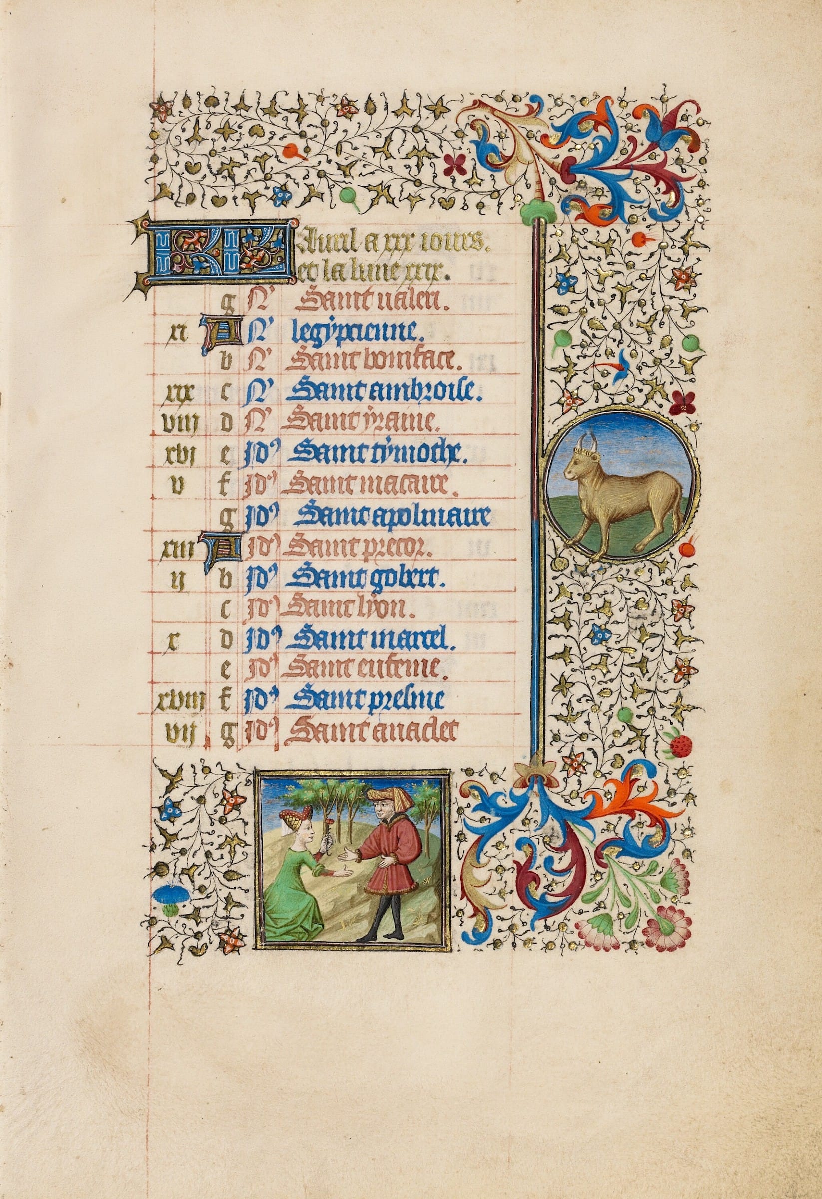 Centuries earlier in Medieval Europe, wealthy patrons saw calendars inside Books of Hours described as "Medieval bestsellers." The manuscripts served as prayer books and featured richly colored illuminations that a patron could custom-order, often showing the activities associated with each season. The books frequently opened with a calendar listing religious holidays, then subsequent pages delved into the most important days of each month. A mid-15th century folio from a Book of Hours created in France lists April's religious feasts and includes images of the taurus zodiac sign and a woman holding a flower.