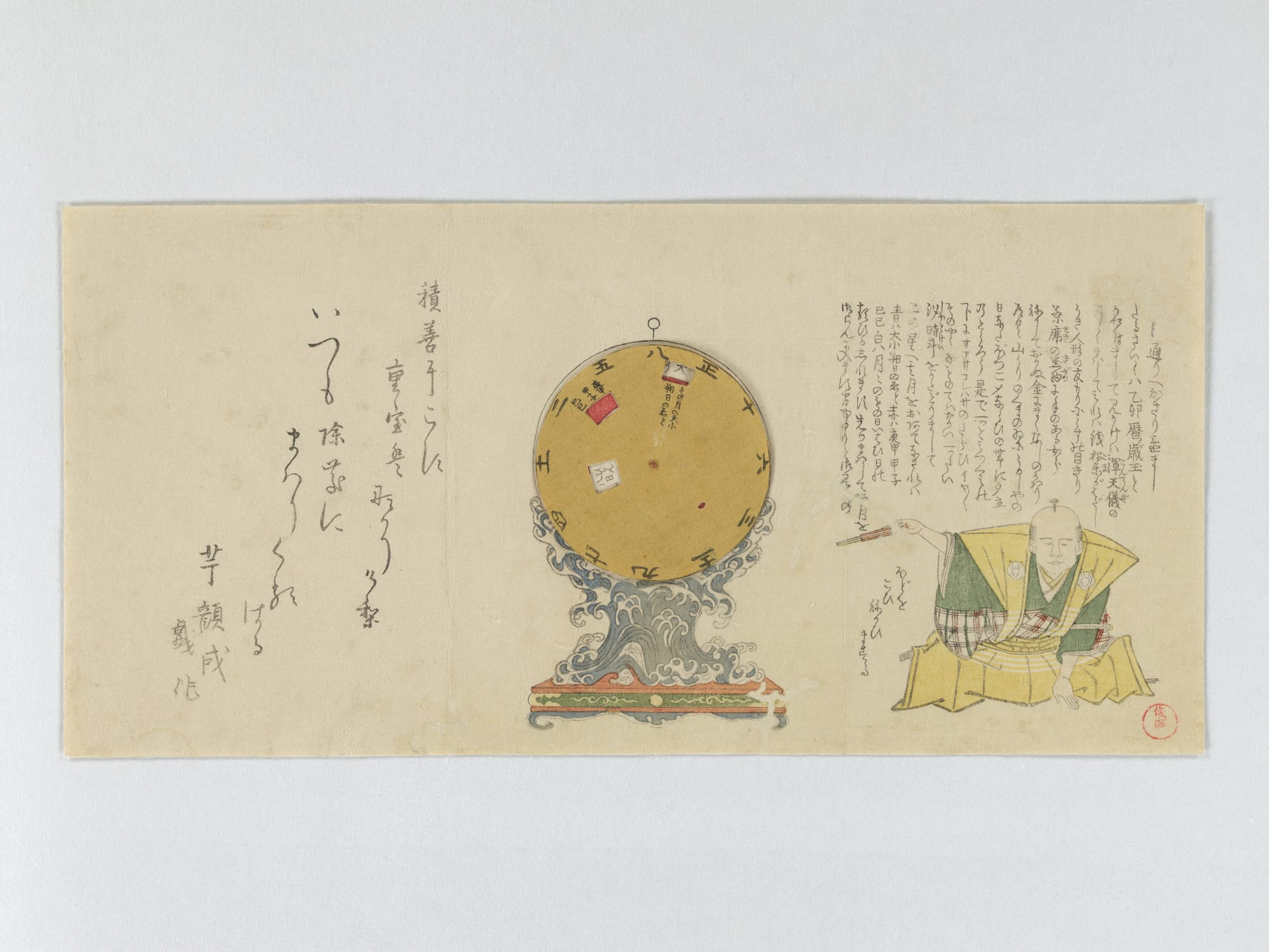 In a 1765 work by Komatsuya Hyakki, the artist depicts the numbers of the 30-day months on the emperor's sleeve and those of the shorter months on the clothing of his deceased consort Lady Li, who appears to the ruler in a vision. Another clever egoyomi shows a storyteller explaining a type of celestial tracking device, the depiction of which comprises a disk that rotates to reveal a spinning calendar.