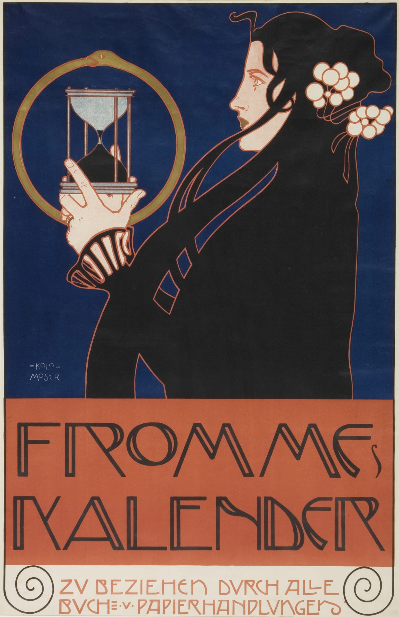 In more recent art history, the Viennese Secession and the Art Nouveau movements provided a seemingly endless supply of colorfully printed calendars, with richly colored pages placing the artistic style — defined by swirling curved lines — on full display. Perhaps the best known is the 1899 "Frommes Kalender" by Koloman Moser, one of the founding members of the Vienna Secession movement. The illustration served as the front page of a calendar by the eponymous company. Moser's subject holds an hourglass and launches a cold and steadied stare toward a subject beyond the confines of the lithograph. The work has been interpreted as a visual representation of the anxieties experienced by the rapidly industrializing turn-of-the-century Viennese society, which would soon collapse with the outbreak of World War I.