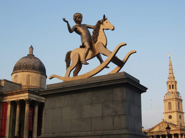 The plinth itself, originally erected to host a sculpture of William IV to compliment three adjacent equestrian statues, remained empty for over 150 years until 2005 when it began to play host to a series of roughly annual rolling exhibits. The bronze rocking horse’s relationship with its surroundings is wonderfully evocative offering a resolute challenge and powerful inversion of the imperialist fantasia of Trafalgar Square; a commemoration of youth which punctures the grandiloquent national myth-making and popular historical narratives habitually framed by the set-piece stateliness of Nelson’s Column, the National Gallery, the smattering of foreign embassies and the remaining accumulated trinkets of power.