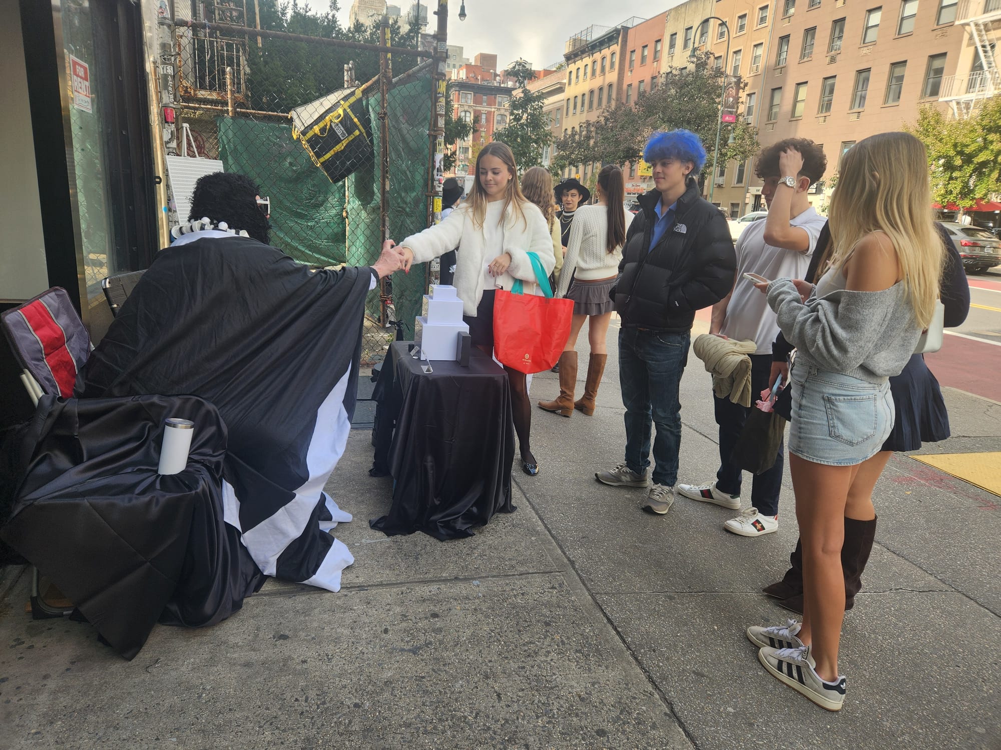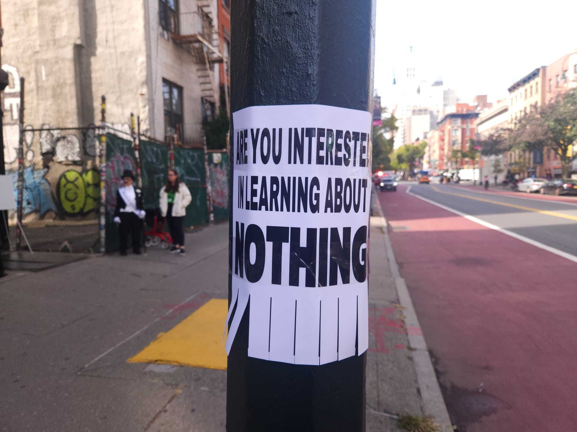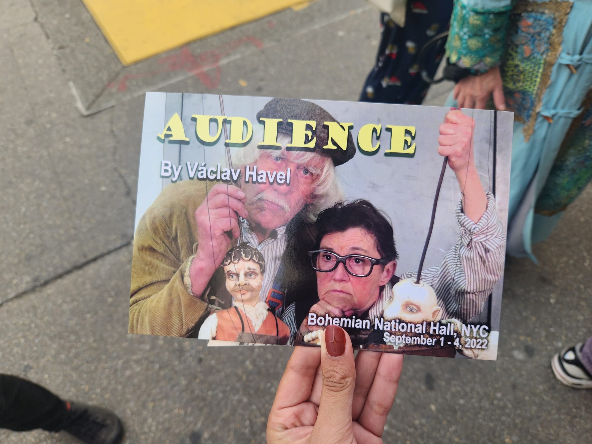 While Woodham and his entourage tabled outside of an empty storefront with bottles of his new fragrance called, of course, "Nothing," playwright and performance artist Lulu Lolo was appointed as the Mayor of Nothing. Members of the Czechoslovak American Marionette Theater (CAMT) made their way toward Union Square, equipped with kazoos and marionette strings sans the actual puppets. CAMT Director Vit Hořejš spelled it out for me: In line with the theme, Czechoslovakia no longer exists. He then handed me a postcard for an event from September 2022 and told me, “This isn't coming up.”