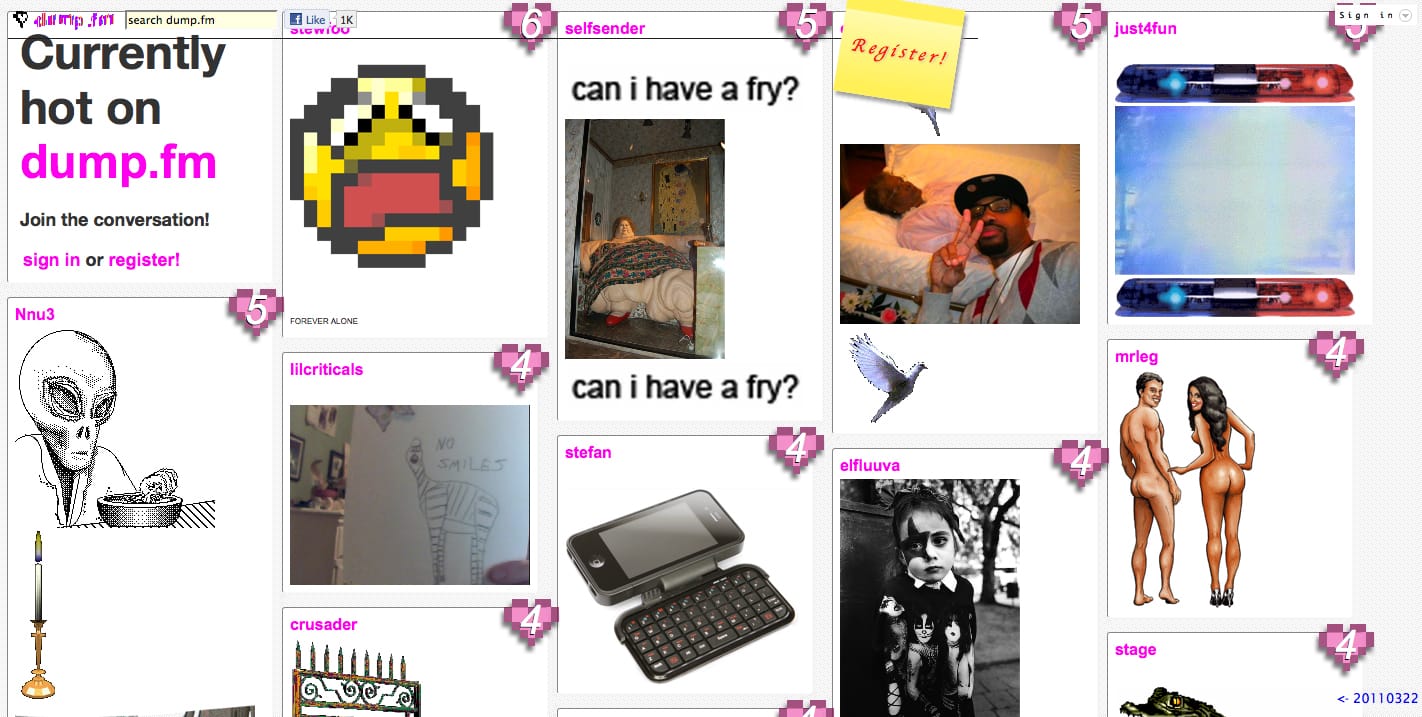 Aggregate art is monolithic from the outside but splits into individual components in its structure. For me, the best example might be 4Chan. From the outside, the website is a monument to sheer human implacability with new images and comments being posted every second within the greater structure of the uniquely sculpted website. Users generate content in an infinity of artistic gestures, and the result fits into a larger context. Internet surf clubs like dump.fm and Spirit Surfers share the same format of image creation and sharing, but the niche operations don’t quite reach the monumental quality 4chan has. Sort of like the Sphinx versus the Giza pyramids, more refined, but just not as mind blowing.