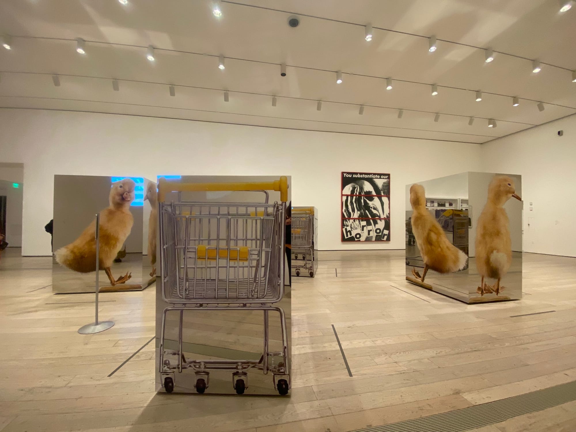 The show features monumental works such as “Untitled (Cowboy)” (2016) by Richard Prince, famous for his practice of “rephotographing” images from advertisements, and Urs Fischer’s “Fritz Lang/Shorty" (2010), a space-dominating set of mirrored boxes, printed with cute ducklings and less cute shopping carts, that capture the reflections of museum visitors as they walk by.
