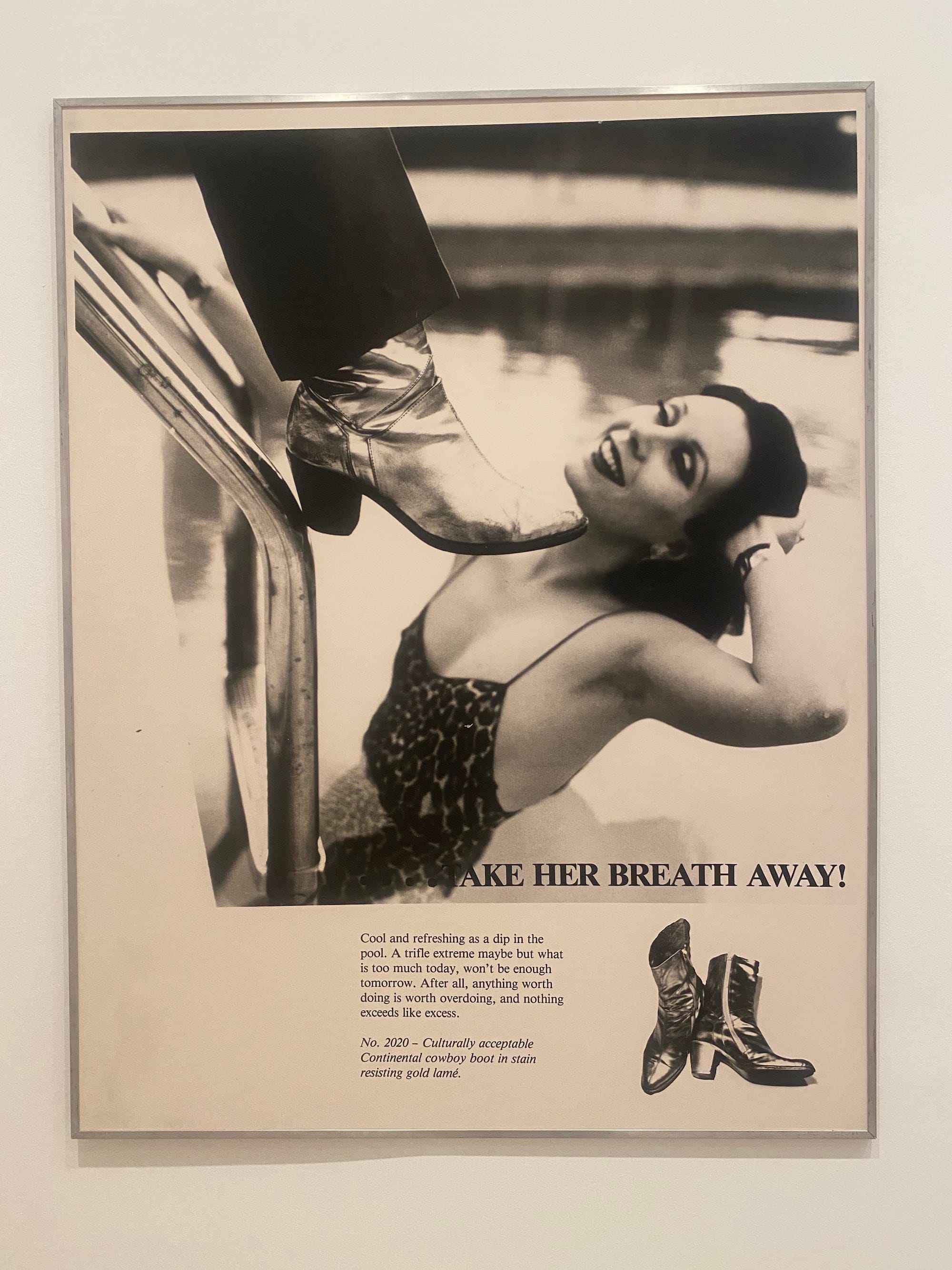 But the show’s smaller works reveal how advertising can have outsize influence on society while being not much larger than a standard sheet of paper. Sherrie Levine’s “President Profile I" (1979, printed 1993), for instance, superimposes a fashion editorial on a 1932 cutout profile of President George Washington by sculptor John Flanagan. Victor Burgin’s series US77 (1977) uses magazine-style spreads to critique gender roles. As one caption in Burgin’s spreads reads, the feminine image of “homemaker” is “an image to which advertisers hypocritically refer as if it were the ringmaster in their circus of commodities, and not one of their clowns.”