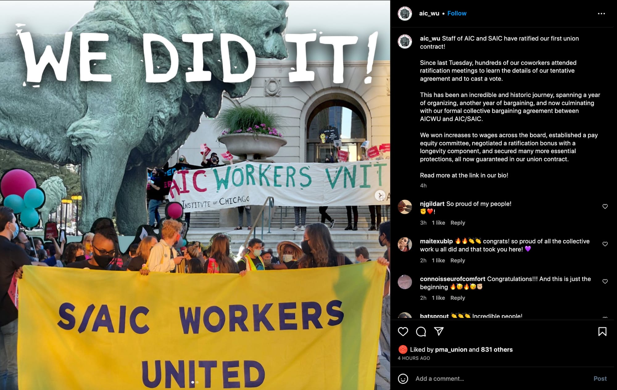 Michael Zapata, an academic advisor at SAIC who was on the organizing committee for AICWU, told Hyperallergic that the ratification was "a substantial win for arts workers in Chicago."