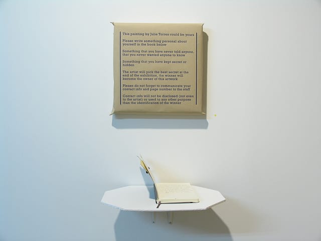 Julie Torres brings us into the era of the sweepstakes, her piece “Is This Free?” uses the promise of a free, unseen painting — the artist will give the piece to whomever she deems has the best secret — to prompt visitors to write secrets in a notebook. While the breadth of this exhibition is certainly expansive to the point of distraction it is certainly carefully considered and thoughtful. This exhibition is worth a good hard look.