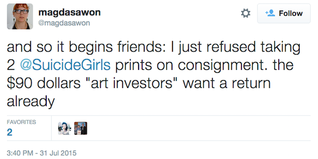 Art dealer Magda Sawon claimed to have rejected a consignment of two prints by the Suicide Girls. Back in May, the Suicide Girls published prints of their Instagram posts in protest over Richard Prince’s appropriation of their images.