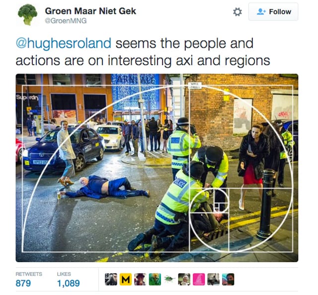 Joel Goodman‘s photograph of drunken New Year’s revelers in Manchester, England became a viral hit after Twitter user @GroenMNG applied a Fibonacci spiral to its composition.