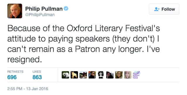 Philip Pullman resigned as a patron of the Oxford Literary Festival in protest over its refusal to pay writers.