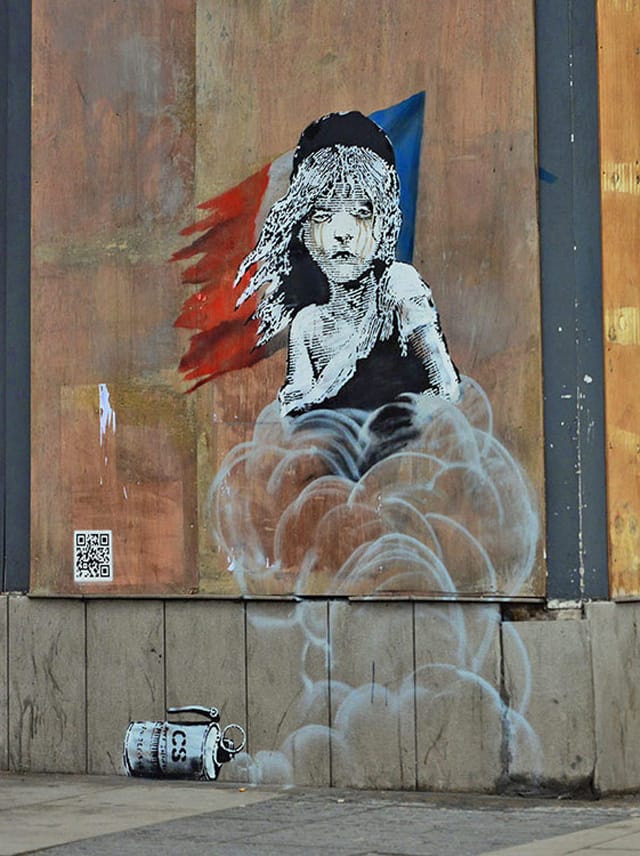 Google preserved Banksy‘s latest mural for their Cultural Institute project. The work, which comments on the use of teargas at the “Jungle” — Calais’ refugee camp — features the iconic girl from the musical Les Misérables.