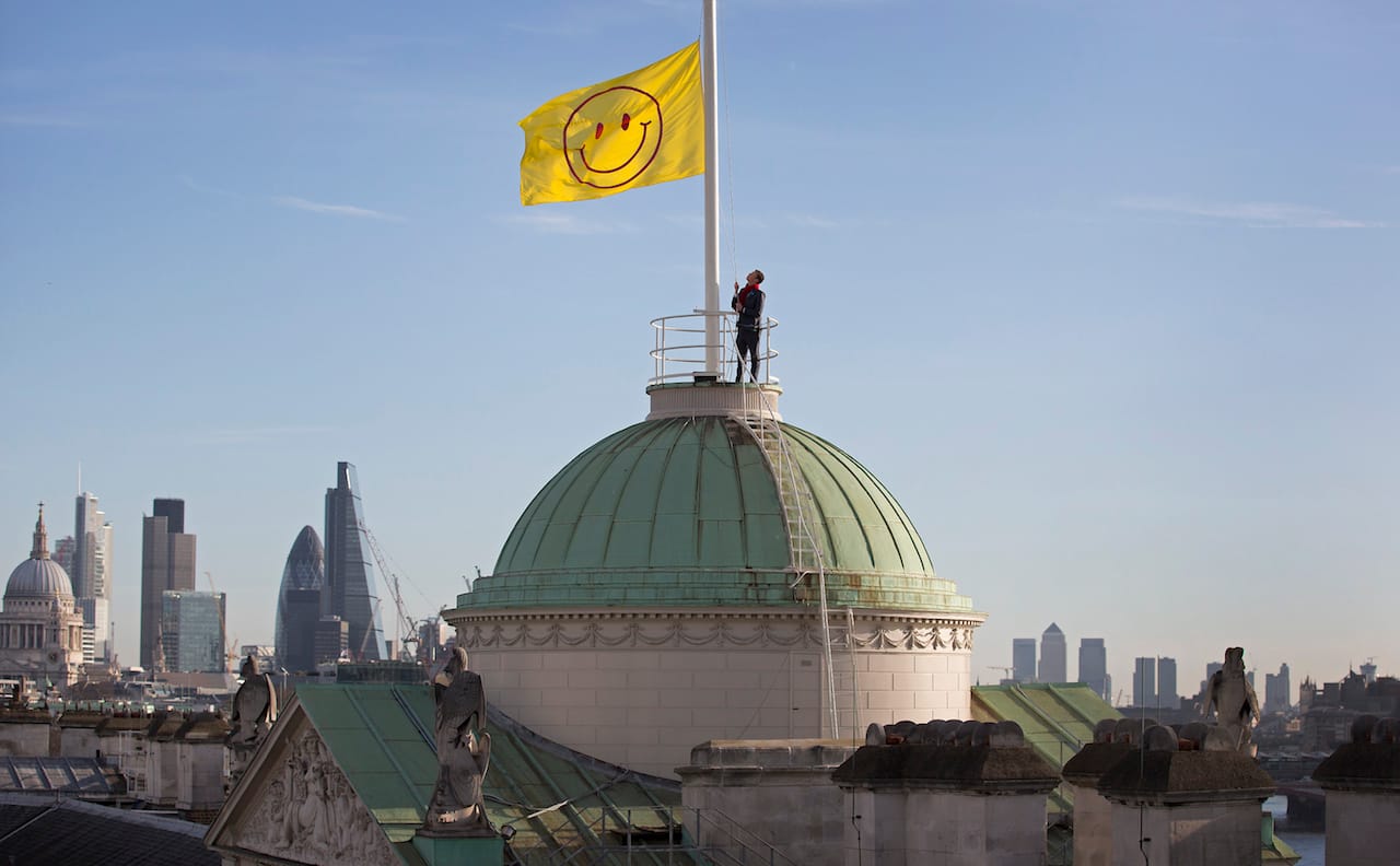 Jeremy Deller and Fraser Muggeridge unveiled their jointly designed smiley face flag atop Somerset House in London. The flag was designed to mark UTOPIA 2016: A Year of Imagination and Possibility, a series of exhibitions and events celebrating the 500th anniversary of the publication of Thomas More’s novel Utopia.