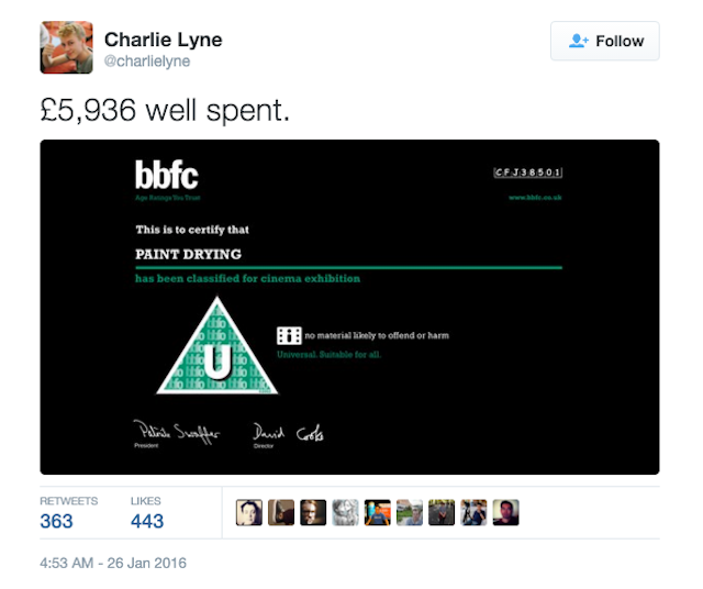 Following his Kickstarter success, filmmaker Charlie Lyne submitted his ten-hour, single shot film of paint drying on a wall to the British Board of Film Classification (BBFC). Lyne produced the film in protest over the fees charged by the BBFC in order to review a film for cinematic release. Having reviewed Paint Drying over the course of two sittings, the BBFC gave the film a U certificate (the equivalent of a G rating in the US).