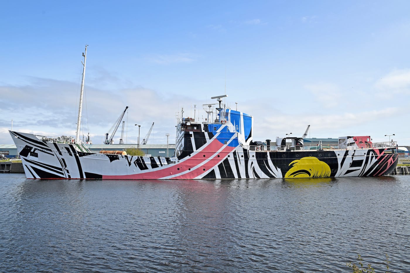 Ciara Phillips‘s “Every Woman,” a dazzle design commissioned for the MV Fingal, was unveiled to mark the centenary of the Battle of Jutland. The Turner Prize nominee is the fourth artist commissioned by 14–18 NOW to create a dazzle design for a ship. Dazzle camouflage, also known as “razzle dazzle,” was extensively used during World War I in order to frustrate the enemy’s estimation of a ship’s speed and heading.