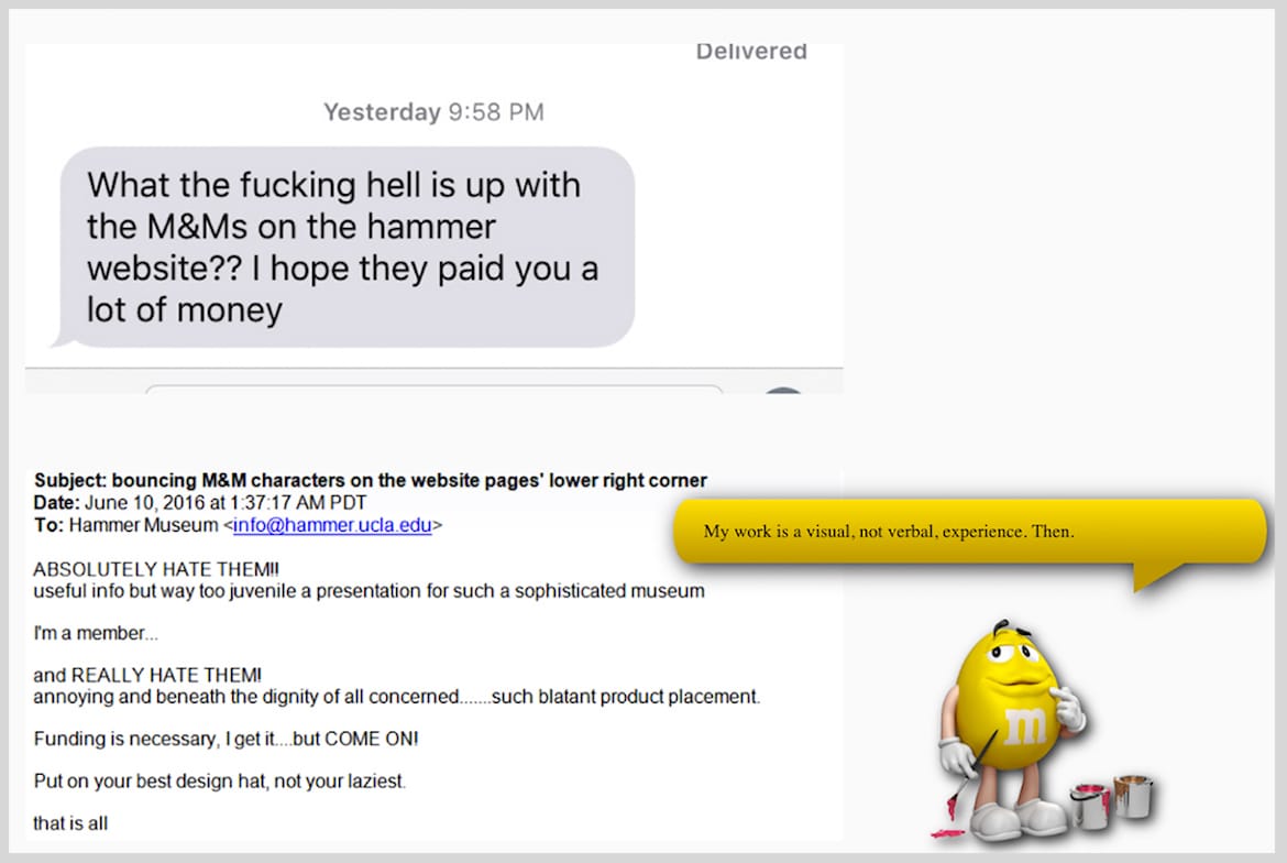 An animation commissioned for the Hammer Museum website received a mixed reaction, with many users mistaking the work for an advertisement. The artwork, which consists of M&M’s characters spouting artists’ statements sourced from Indexhibit, was created by Guthrie Lonergan for the biennial Made in LA exhibition.