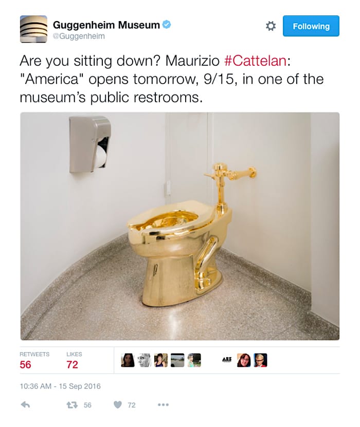 Maurizio Cattelan installed a fully functional, 18-karat solid gold toilet at the Guggenheim Museum. The work is entitled “America.”
