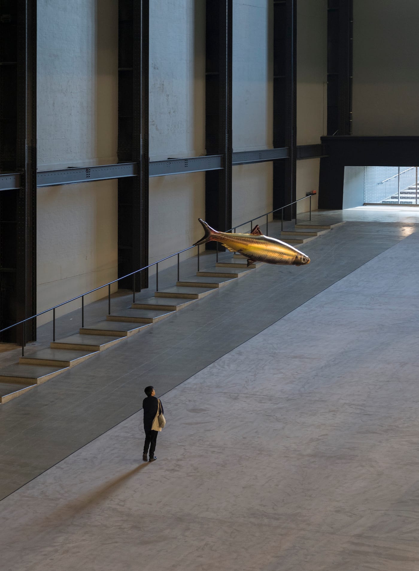 Tate Modern unveiled Philippe Parreno‘s commission for the Turbine hall. The work is comprised of flickering lights, speakers, acoustic panels, a screen, a carpet, and a number of fish-shaped balloons.