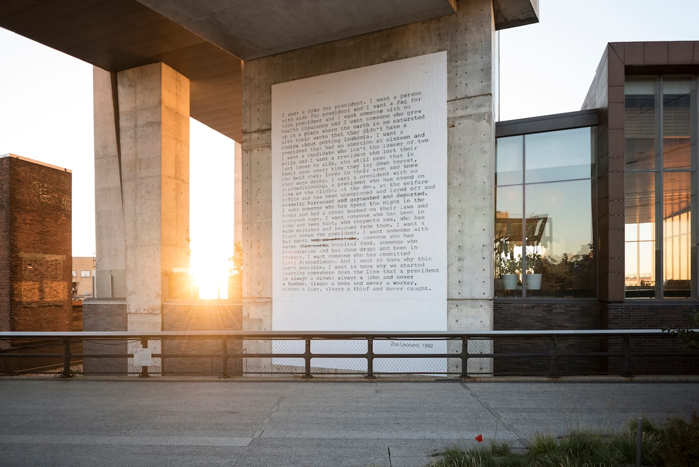 A monumental edition of Zoe Leonard‘s “I want a President” was installed on the High Line. Leonard created the text piece, which starts with the sentence “I want a dyke for president,” during Eileen Myles’s campaign as an independent presidential candidate in 1992.