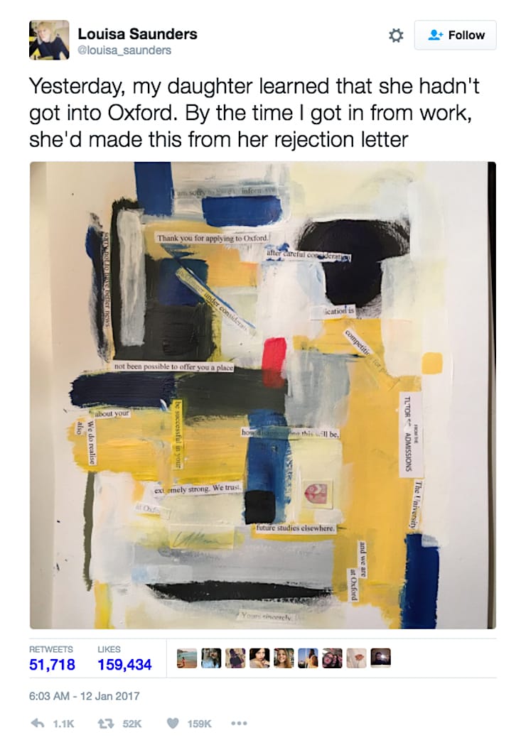 An abstract work of art made from an Oxford University rejection letter went viral after being posted on Twitter. 18-year-old Claudia Vulliamy made the work after her application to study classics at Wadham College was rejected. “I hadn’t set my heart on Oxford, I’m happy I got an offer from Durham” Vulliamy told the BBC.