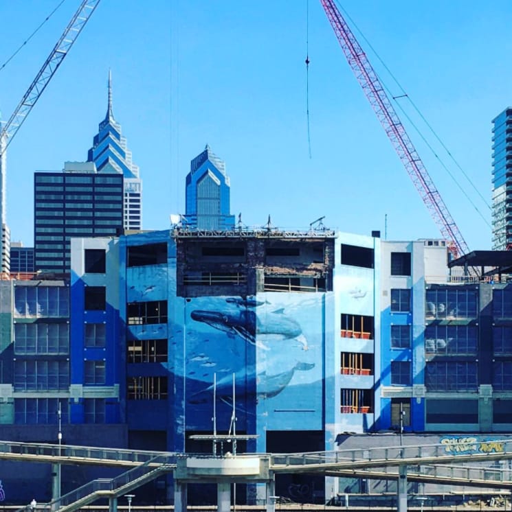 Philadelphia’s iconic “East Coast Humpbacks” mural (1993) at 2400 Market Street is being demolished to make way for Aramark’s new headquarters. The work is one of the last remaining 100 Whaling Wall murals painted by artist Robert Wyland between 1981 and 2008.