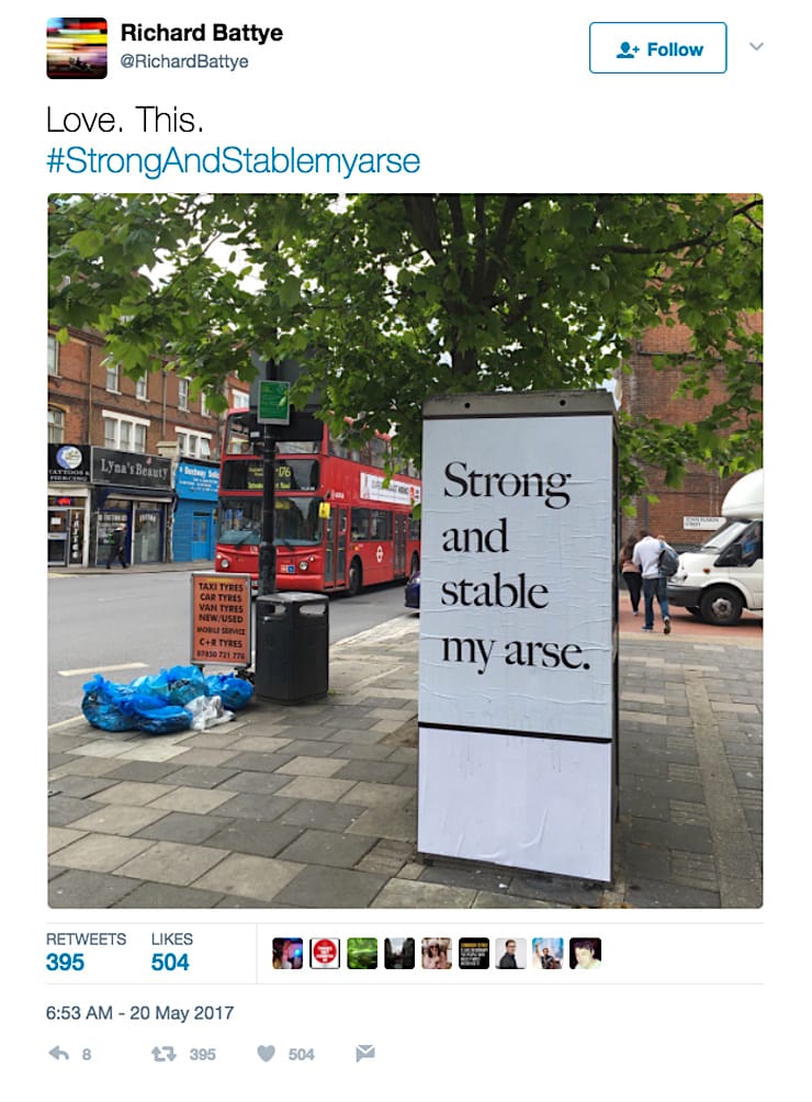 Turner Prize-winning artist Jeremy Deller confirmed authorship of a poster featuring the phrase “Strong and stable my arse,” a play on the oft-repeated (and much derided) campaign slogan of Prime Minister Theresa May. The poster was wheatpasted at various locations across London last weekend.