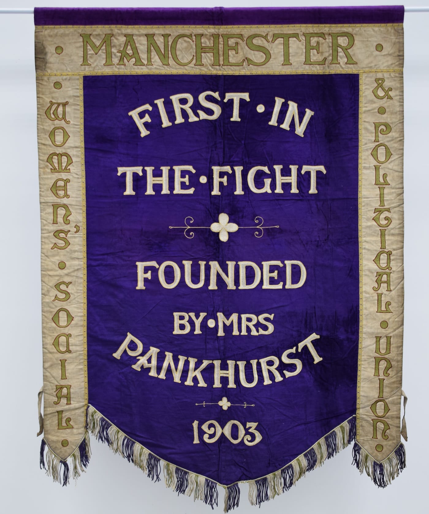 The People’s History Museum acquired an embroidered banner used as a backdrop for Emmeline Pankhurst’s suffrage speeches. The banner had sat in the back of a charity shop in Leeds for a decade.
