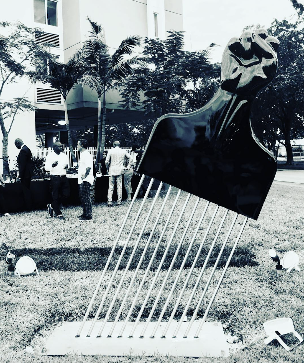 Hank Willis Thomas’s “All Power to All People,” an eight-foot-tall sculpture of an afro pick punctuated by a clenched fist, was installed at Town Center Apartments in Opa-locka, Florida.