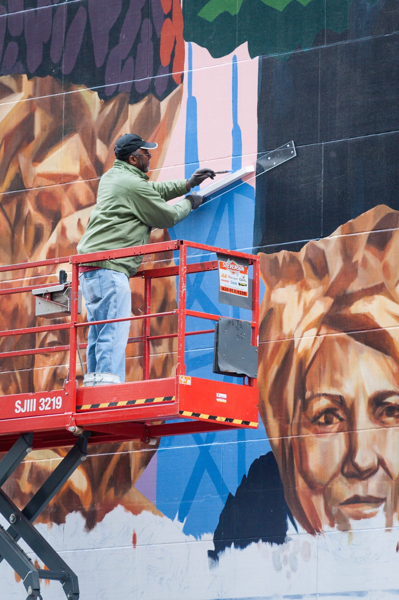 Kerry James Marshall unveiled a 132-foot by 100-foot mural celebrating 20 iconic Chicago women. The work includes Oprah Winfrey, AfriCobra co-founder Barbara Jones-Hogu, literary figures Gwendolyn Brooks and Sandra Cisneros, and Jackie Taylor, the founder and CEO of the Black Ensemble Theater.