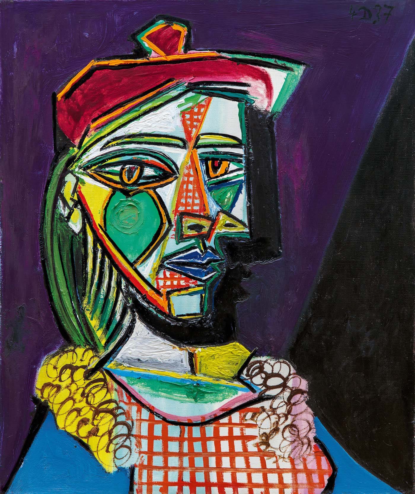 Pablo Picasso’s “Femme au béret et à la robe quadrillée (Marie-Thérèse Walter)”(1937) was sold at Sotheby’s in London for £49,827,000 (~$68.6 million, including buyer’s premium), the second-highest price for a work of art sold at auction in Europe.