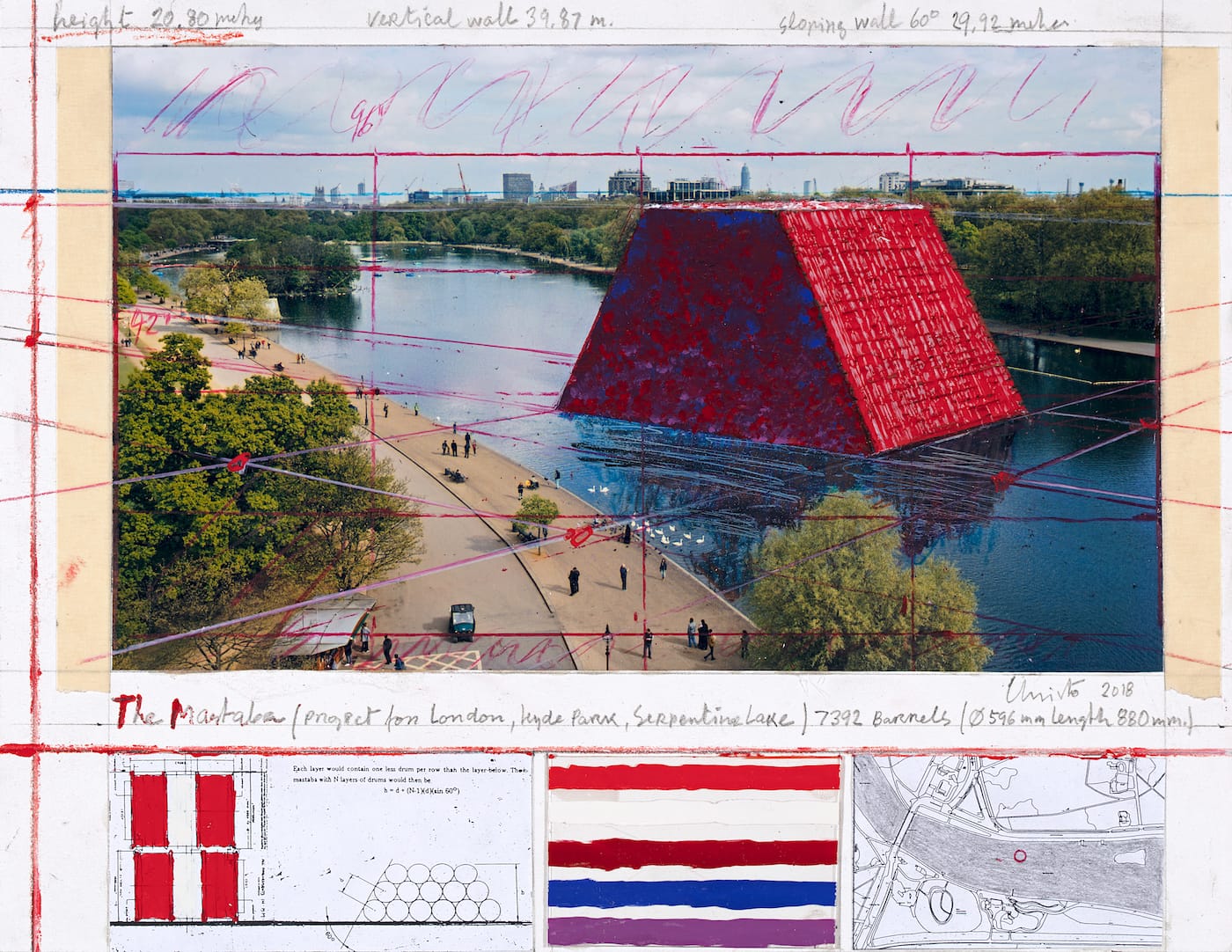 Construction began on Christo’s monumental sculpture “The Mastaba (Project for London, Hyde Park, Serpentine Lake)” (2018). The temporary sculpture, which consists of 7,506 horizontally stacked barrels, will float on the Serpentine through September 23.