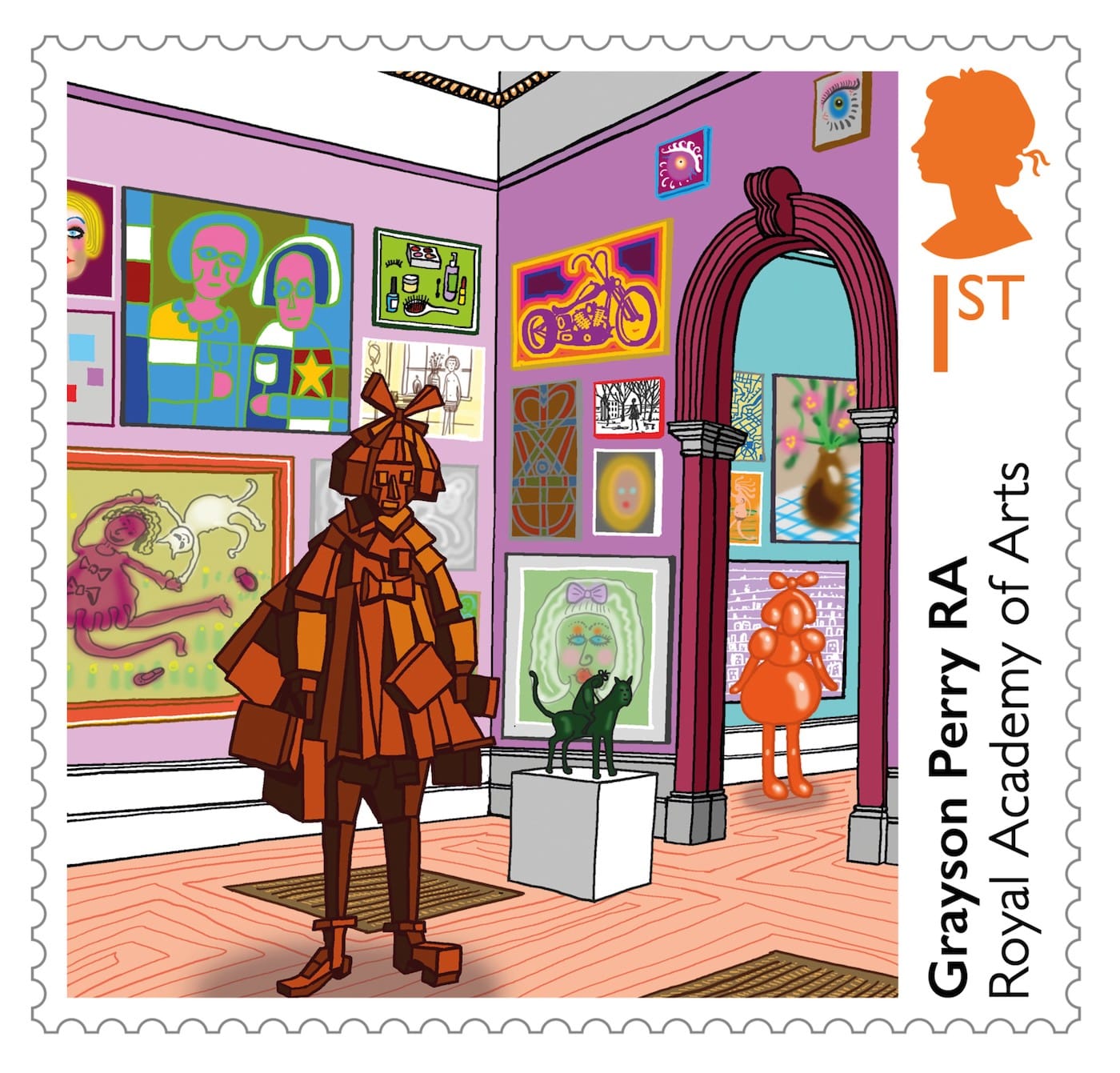 Royal Mail issued six new stamps to mark the 250th anniversary of the Royal Academy of Arts. The designs — all newly commissioned artworks — were created by Norman Ackroyd, Tracey Emin, Grayson Perry, Fiona Rae, Barbara Rae, and Yinka Shonibare.