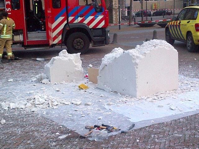 Firefighters freed an artist from a block of gypsum plaster in Rotterdam. The artist, an unidentified women, began to run out of oxygen during a botched street art project.