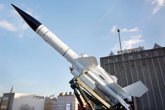 The Hayward Gallery installed a 6.5-ton ground-to-air defense missile on its balcony as part of its latest exhibition, History is Now. The missile, which is on loan from the RAF Defense Radar Museum in Norfolk, is part of Richard Wentworth’s curatorial contribution to the show.